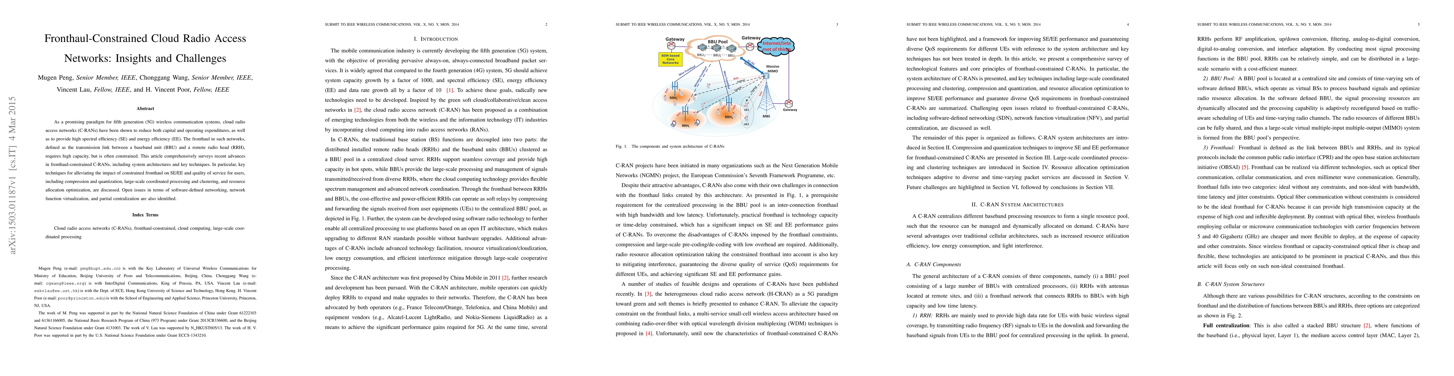 This paper surveys recent advances in cloud radio access networks (C-RANs) under fronthaul constraints, focusing on techniques to maintain high spectral and energy efficiency despite limited fronthaul capacity. Key methods include compression, quantization, coordinated processing, and resource allocation optimization.