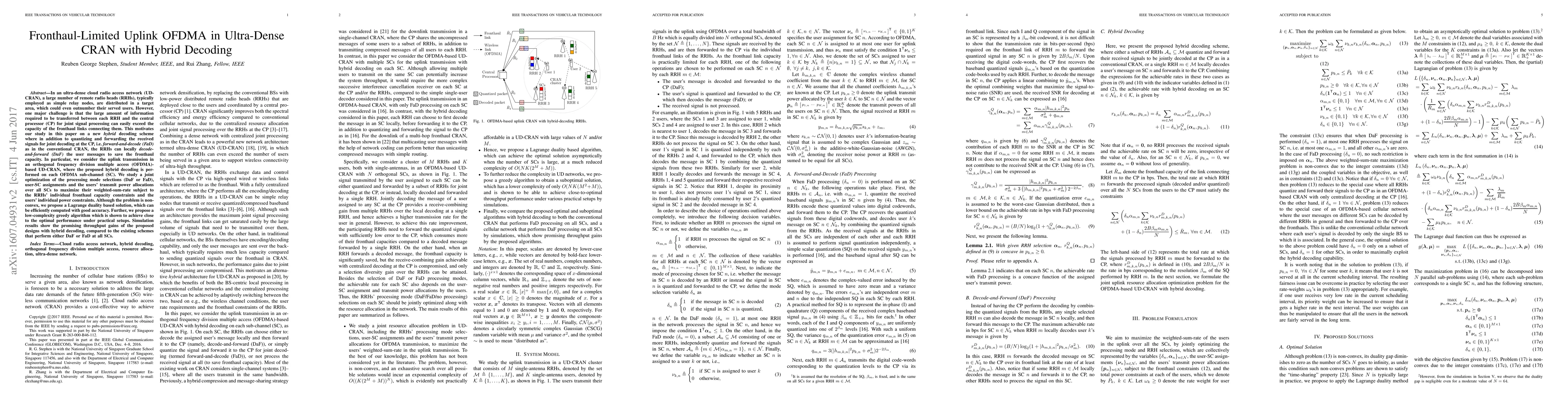 This paper explores a hybrid decoding scheme in ultra-dense cloud radio access networks (UD-CRAN) to manage fronthaul link capacity limitations. It proposes a joint optimization approach for processing mode selection, user-subchannel assignment, and transmit power allocation to maximize weighted-sum-rate, using a Lagrange duality-based solution and a low-complexity greedy algorithm.