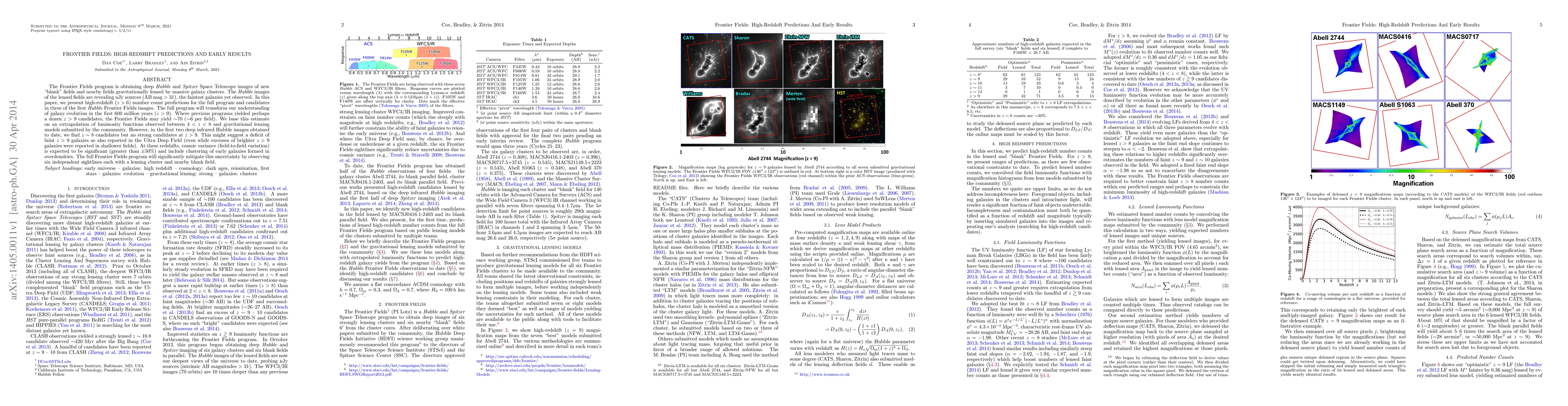 The Frontier Fields program is obtaining deep Hubble and Spitzer Space Telescope images of new "blank" fields and nearby fields gravitationally lensed by massive galaxy clusters. The Hubble images of the lensed fields are revealing nJy sources (AB mag > 31), the faintest galaxies yet observed. In this paper, we present high-redshift (z > 6) number count predictions for the full program and candidates in three of the first Hubble Frontier Fields images. The full program will transform our understanding of galaxy evolution in the first 600 million years (z > 9). Where previous programs yielded perhaps a dozen z > 9 candidates, the Frontier Fields may yield ~70 (~6 per field). We base this estimate on an extrapolation of luminosity functions observed between 4 < z < 8 and gravitational lensing models submitted by the community. However, in the first two deep infrared Hubble images obtained to date, we find z ~ 8 candidates but no strong candidates at z > 9. This might suggest a deficit of faint z > 9 galaxies as also reported in the Ultra Deep Field (even while excesses of brighter z > 9 galaxies were reported in shallower fields). At these redshifts, cosmic variance (field-to-field variation) is expected to be significant (greater than +/-50%) and include clustering of early galaxies formed in overdensities. The full Frontier Fields program will significantly mitigate this uncertainty by observing six independent sightlines each with a lensing cluster and nearby blank field.