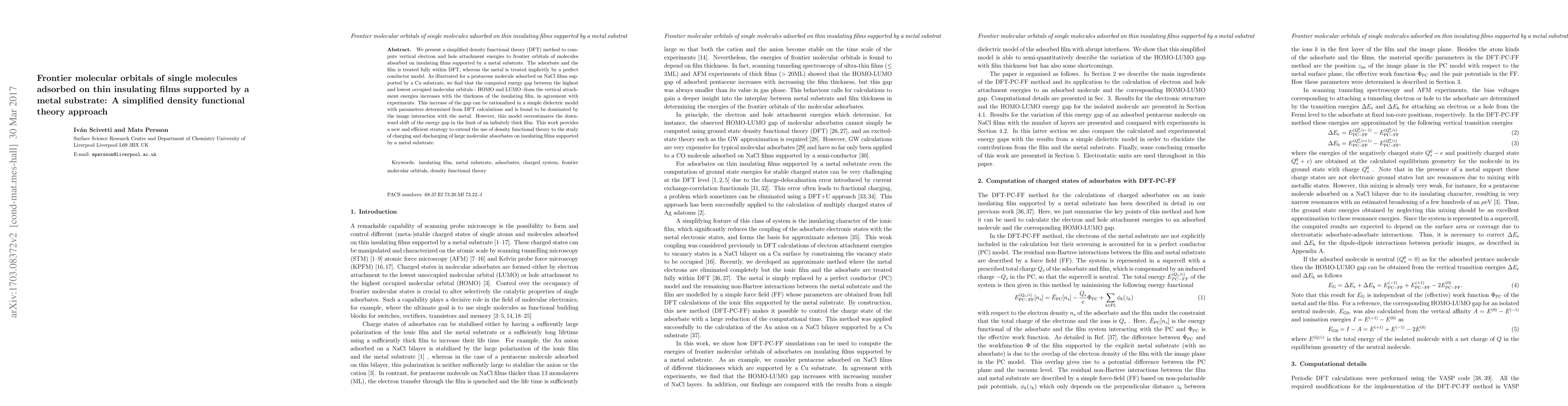 We present a simplified density functional theory (DFT) method to com- pute vertical electron and hole attachment energies to frontier orbitals of molecules absorbed on insulating films supported by a metal substrate. The adsorbate and the film is treated fully within DFT, whereas the metal is treated implicitly by a perfect conductor model. As illustrated for a pentacene molecule adsorbed on NaCl films sup- ported by a Cu substrate, we find that the computed energy gap between the highest and lowest occupied molecular orbitals - HOMO and LUMO -from the vertical attach- ment energies increases with the thickness of the insulating film, in agreement with experiments. This increase of the gap can be rationalized in a simple dielectric model with parameters determined from DFT calculations and is found to be dominated by the image interaction with the metal. However, this model overestimates the down- ward shift of the energy gap in the limit of an infinitely thick film. This work provides a new and efficient strategy to extend the use of density functional theory to the study of charging and discharging of large molecular absorbates on insulating films supported by a metal substrate.