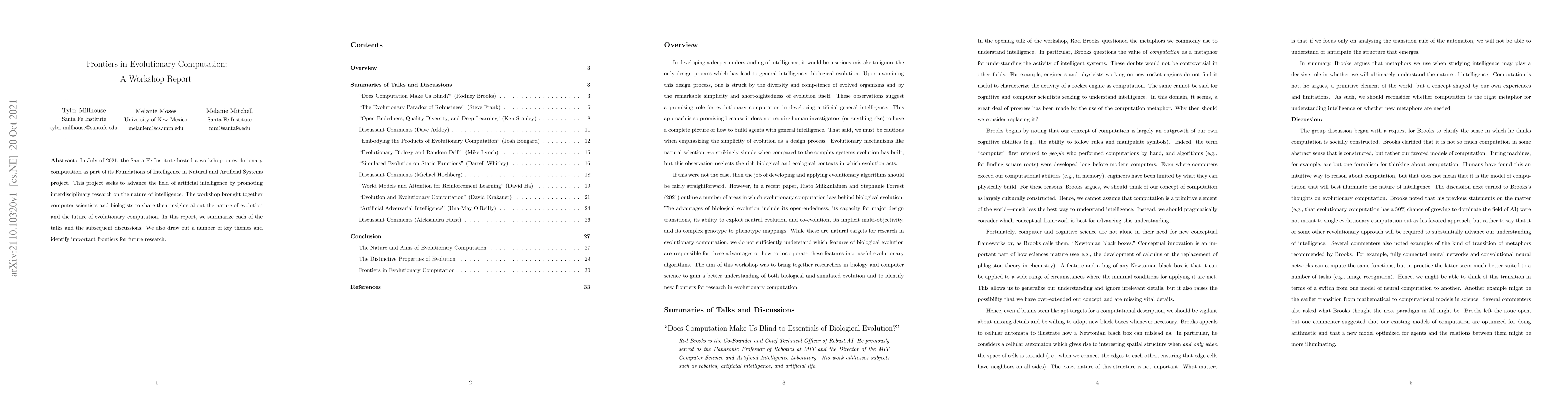 The Santa Fe Institute's 2021 workshop on evolutionary computation emphasized interdisciplinary collaboration between computer scientists and biologists to explore the nature of evolution and future directions in the field. Key themes and emerging research frontiers were identified for advancing artificial intelligence.