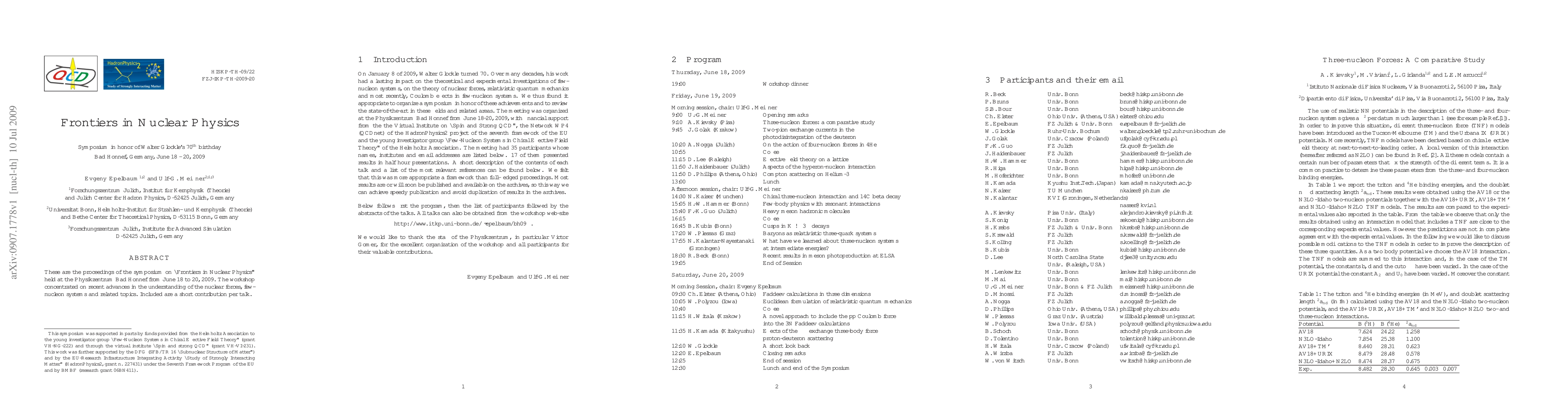 These are the proceedings of the symposium on ``Frontiers in Nuclear Physics'' held at the Physikzentrum Bad Honnef from June 18 to 20, 2009. The workshop concentrated on recent advances in the understanding of the nuclear forces, few-nucleon systems and related topics. Included are a short contribution per talk.