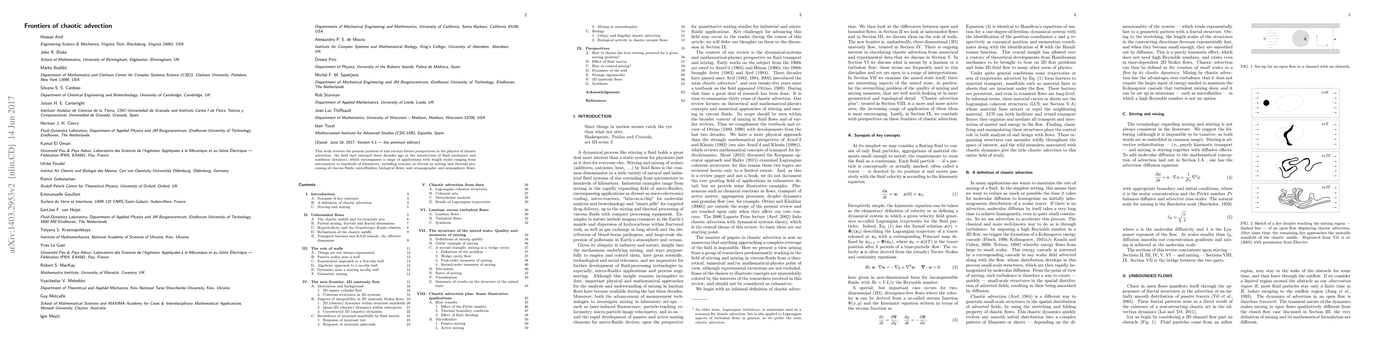 This work reviews the present position of and surveys future perspectives in the physics of chaotic advection: the field that emerged three decades ago at the intersection of fluid mechanics and nonlinear dynamics, which encompasses a range of applications with length scales ranging from micrometers to hundreds of kilometers, including systems as diverse as mixing and thermal processing of viscous fluids, microfluidics, biological flows, and oceanographic and atmospheric flows.