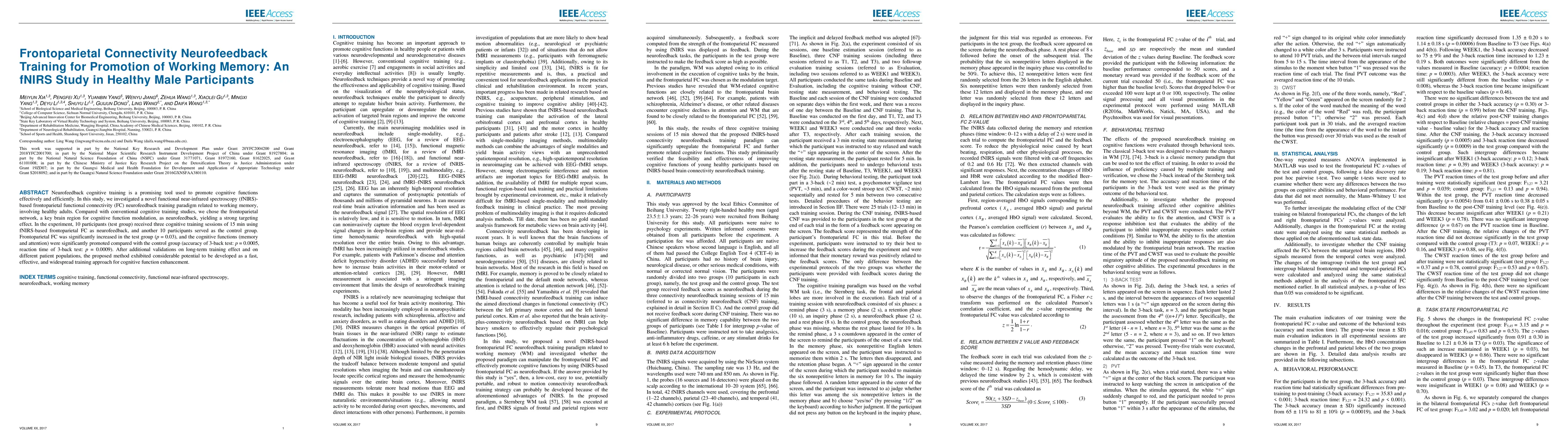 This study explores the efficacy of fNIRS-based frontoparietal connectivity neurofeedback training to enhance working memory in healthy adult males. The test group showed significant improvements in frontoparietal connectivity and cognitive functions (memory and attention) compared to the control group, indicating the potential of this approach for cognitive enhancement.