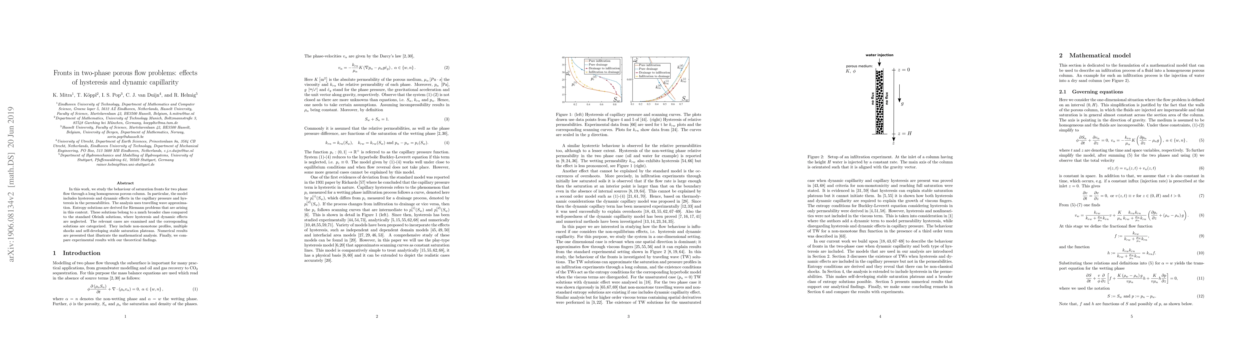 This paper investigates saturation fronts in two-phase flow through porous media, incorporating hysteresis and dynamic capillarity effects. It derives entropy solutions for Riemann problems, revealing non-monotone profiles, multiple shocks, and stable saturation plateaus, and compares theoretical findings with experimental results.