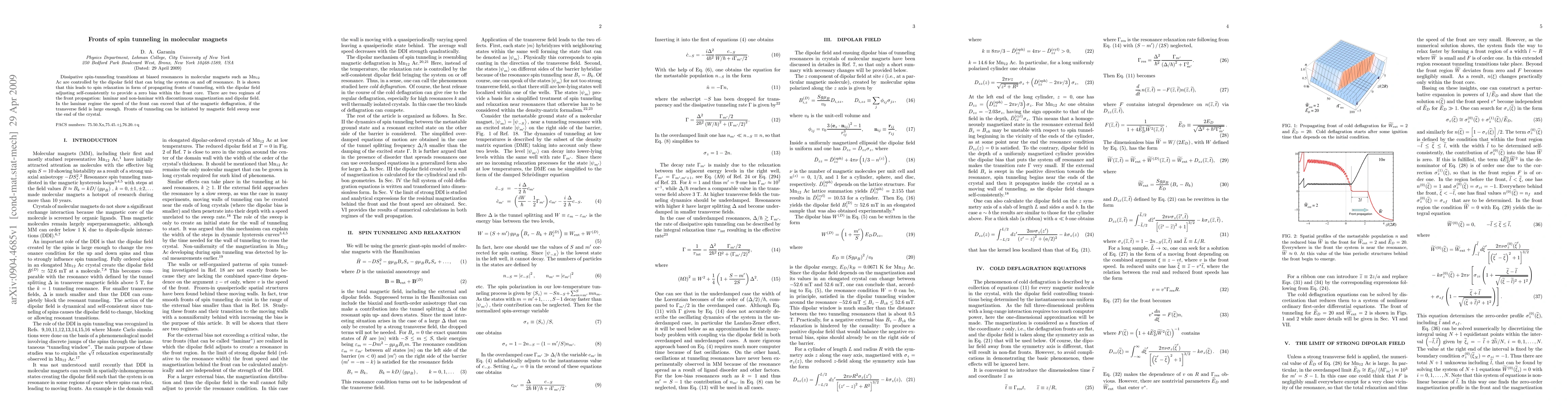 This paper investigates spin-tunneling phenomena in molecular magnets like Mn-12 Ac, where dipolar fields control spin relaxation through propagating fronts of tunneling. Two regimes of front propagation are identified: laminar, where front speed can surpass magnetic deflagration speed under strong transverse fields, and non-laminar, characterized by discontinuous magnetization and field.