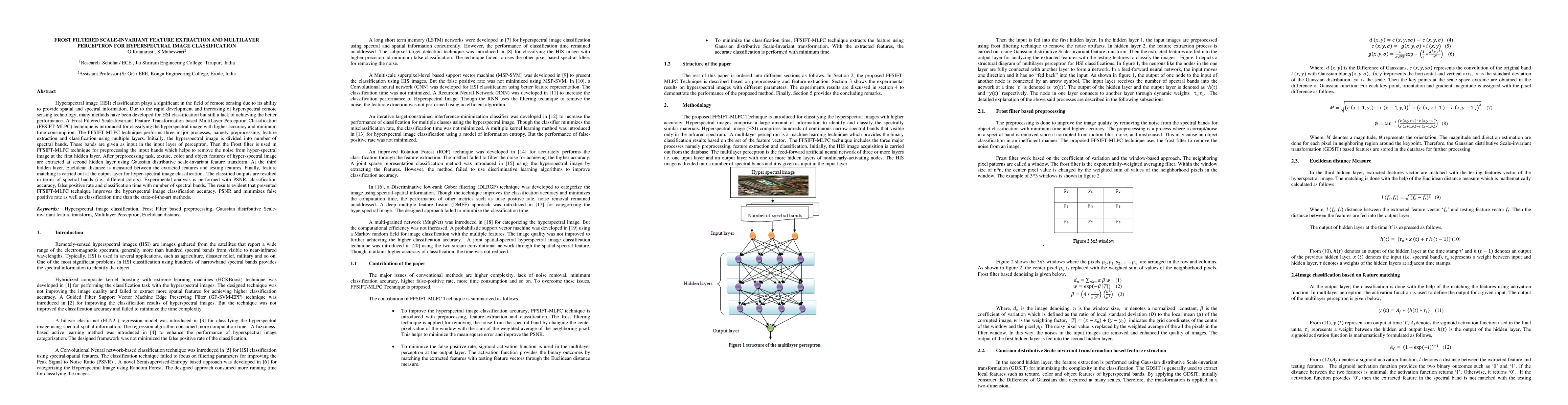 Hyperspectral image (HSI) classification plays a significant in the field of remote sensing due to its ability to provide spatial and spectral information. Due to the rapid development and increasing of hyperspectral remote sensing technology, many methods have been developed for HSI classification but still a lack of achieving the better performance. A Frost Filtered Scale-Invariant Feature Transformation based MultiLayer Perceptron Classification (FFSIFT-MLPC) technique is introduced for classifying the hyperspectral image with higher accuracy and minimum time consumption. The FFSIFT-MLPC technique performs three major processes, namely preprocessing, feature extraction and classification using multiple layers. Initially, the hyperspectral image is divided into number of spectral bands. These bands are given as input in the input layer of perceptron. Then the Frost filter is used in FFSIFT-MLPC technique for preprocessing the input bands which helps to remove the noise from hyper-spectral image at the first hidden layer. After preprocessing task, texture, color and object features of hyper-spectral image are extracted at second hidden layer using Gaussian distributive scale-invariant feature transform. At the third hidden layer, Euclidean distance is measured between the extracted features and testing features. Finally, feature matching is carried out at the output layer for hyper-spectral image classification. The classified outputs are resulted in terms of spectral bands (i.e., different colors). Experimental analysis is performed with PSNR, classification accuracy, false positive rate and classification time with number of spectral bands. The results evident that presented FFSIFT-MLPC technique improves the hyperspectral image classification accuracy, PSNR and minimizes false positive rate as well as classification time than the state-of-the-art methods.
