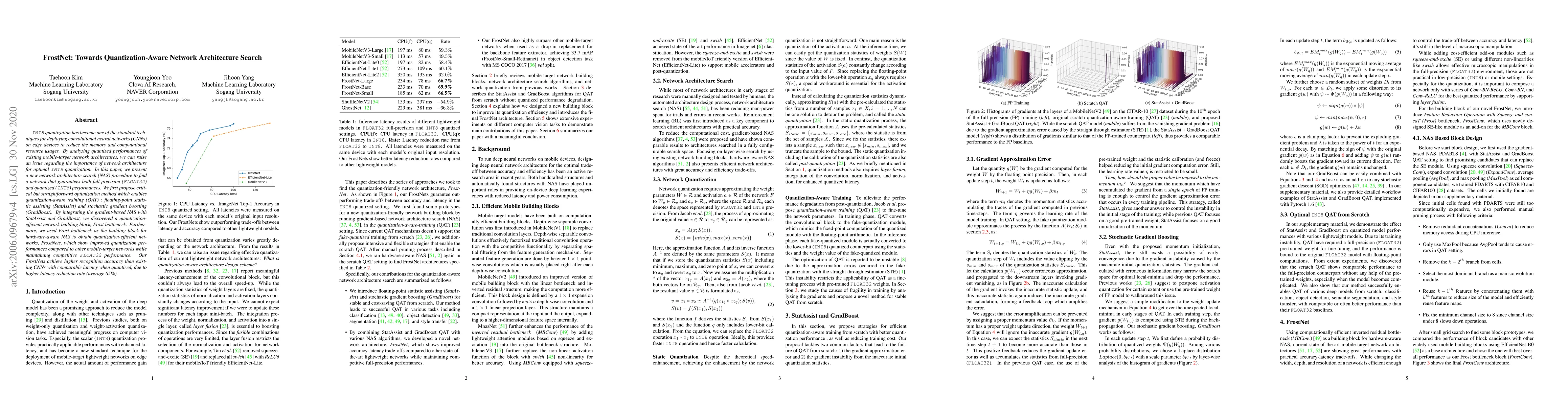 FrostNet introduces a novel network architecture search method that combines quantization-aware training techniques with gradient-based NAS to develop efficient INT8 quantized networks, achieving better accuracy and latency reduction compared to existing CNNs. The Frost bottleneck block, discovered through this method, forms the basis of the FrostNets, which outperform other mobile-target networks in both quantized and full-precision performance.