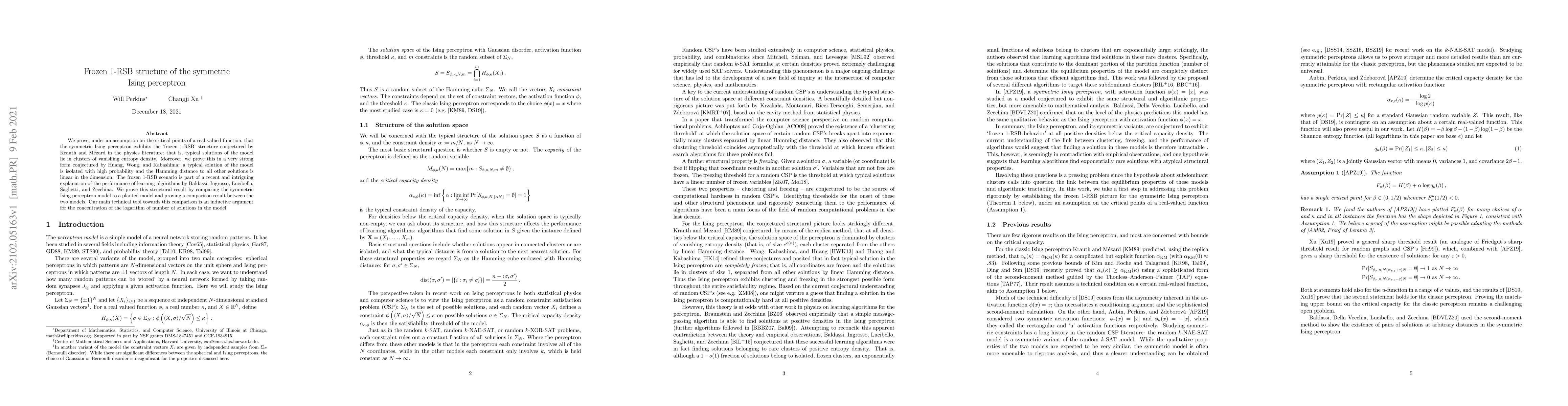 We prove, under an assumption on the critical points of a real-valued function, that the symmetric Ising perceptron exhibits the `frozen 1-RSB' structure conjectured by Krauth and Mezard in the physics literature; that is, typical solutions of the model lie in clusters of vanishing entropy density. Moreover, we prove this in a very strong form conjectured by Huang, Wong, and Kabashima: a typical solution of the model is isolated with high probability and the Hamming distance to all other solutions is linear in the dimension. The frozen 1-RSB scenario is part of a recent and intriguing explanation of the performance of learning algorithms by Baldassi, Ingrosso, Lucibello, Saglietti, and Zecchina. We prove this structural result by comparing the symmetric Ising perceptron model to a planted model and proving a comparison result between the two models. Our main technical tool towards this comparison is an inductive argument for the concentration of the logarithm of number of solutions in the model.