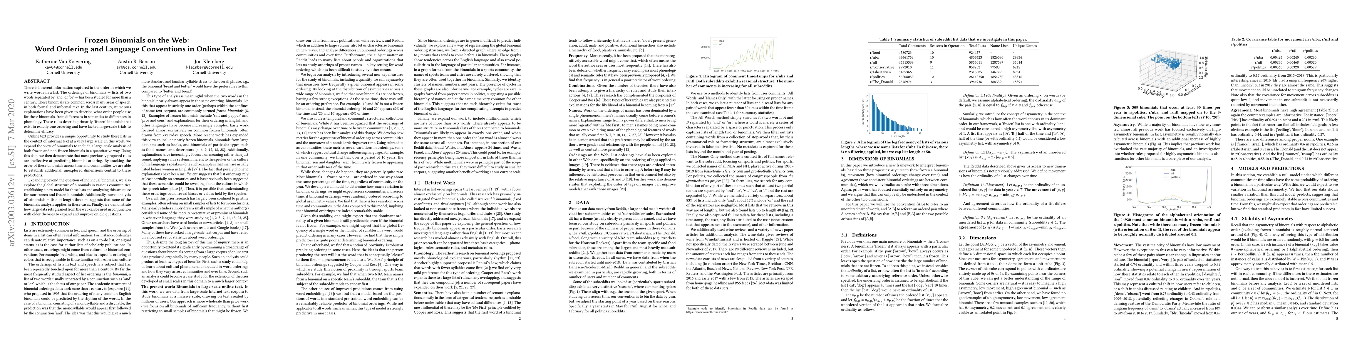 There is inherent information captured in the order in which we write words in a list. The orderings of binomials --- lists of two words separated by `and' or `or' --- has been studied for more than a century. These binomials are common across many areas of speech, in both formal and informal text. In the last century, numerous explanations have been given to describe what order people use for these binomials, from differences in semantics to differences in phonology. These rules describe primarily `frozen' binomials that exist in exactly one ordering and have lacked large-scale trials to determine efficacy. Online text provides a unique opportunity to study these lists in the context of informal text at a very large scale. In this work, we expand the view of binomials to include a large-scale analysis of both frozen and non-frozen binomials in a quantitative way. Using this data, we then demonstrate that most previously proposed rules are ineffective at predicting binomial ordering. By tracking the order of these binomials across time and communities we are able to establish additional, unexplored dimensions central to these predictions. Expanding beyond the question of individual binomials, we also explore the global structure of binomials in various communities, establishing a new model for these lists and analyzing this structure for non-frozen and frozen binomials. Additionally, novel analysis of trinomials --- lists of length three --- suggests that none of the binomials analysis applies in these cases. Finally, we demonstrate how large data sets gleaned from the web can be used in conjunction with older theories to expand and improve on old questions.