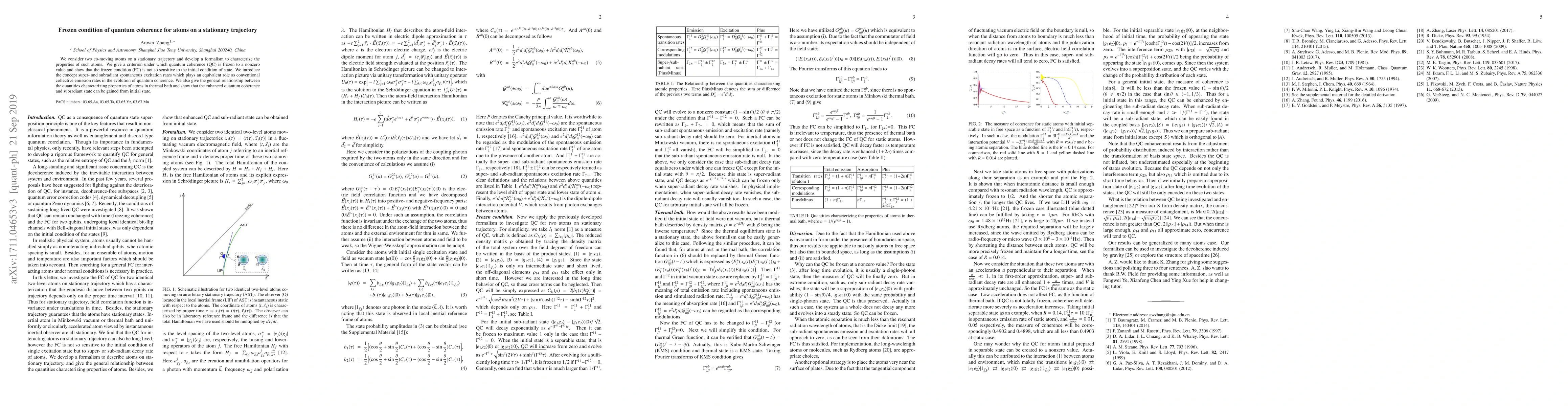We consider two co-moving atoms on a stationary trajectory and develop a formalism to characterize the properties of such atoms. We give a criterion under which quantum coherence (QC) is frozen to a nonzero value and show that the frozen condition (FC) is not so sensitive to the initial condition of state. We introduce the concept super- and subradiant spontaneous excitation rates which plays an equivalent role as conventional collective emission rates in the evolution of quantum coherence. We also give the general relationship between the quantities characterizing properties of atoms in thermal bath and show that the enhanced quantum coherence and subradiant state can be gained from initial state.