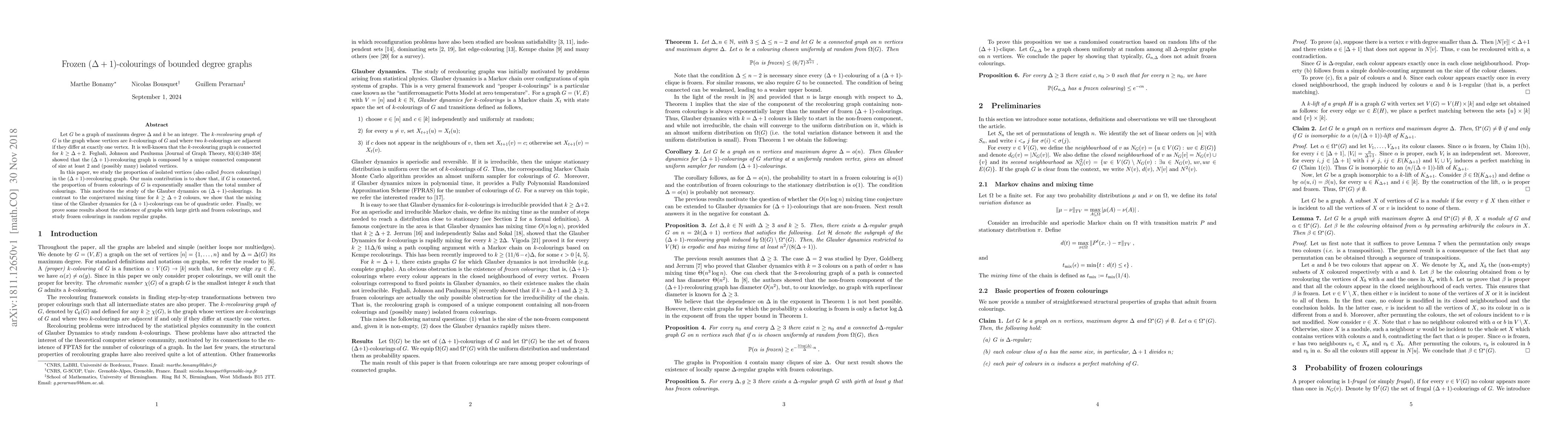 The paper presents a novel bound on the proportion of frozen (\u039+1)-colourings in the recolouring graph and analyzes the mixing time of Glauber dynamics for (\u039+1)-colourings, contrasting it with the conjectured mixing time for k\u00b7\u039+2 colours.
