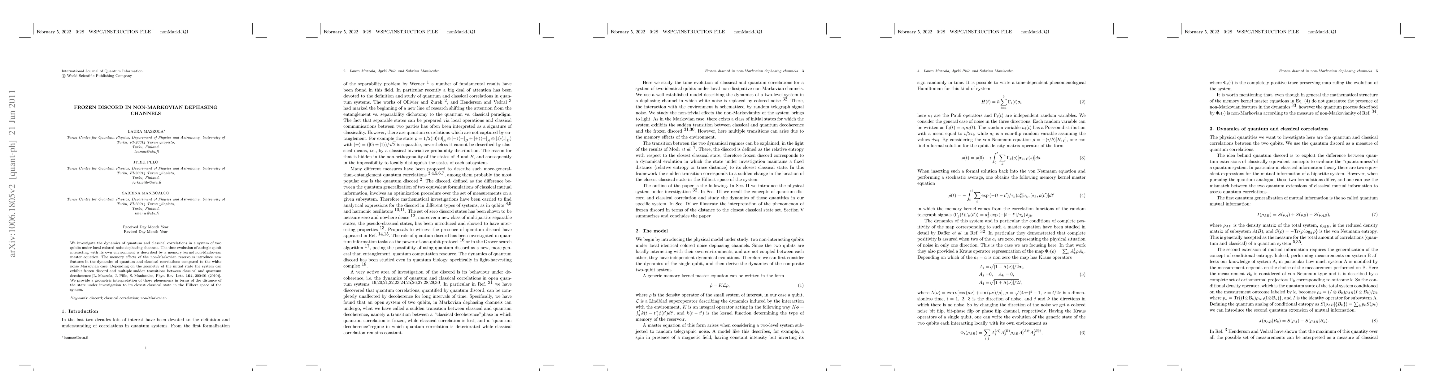 This paper explores the dynamics of quantum and classical correlations in two qubits under local non-Markovian dephasing channels, revealing phenomena like frozen discord and multiple sudden transitions due to memory effects in the environment. The study provides a geometric interpretation of these dynamics based on the distance to the nearest classical state.