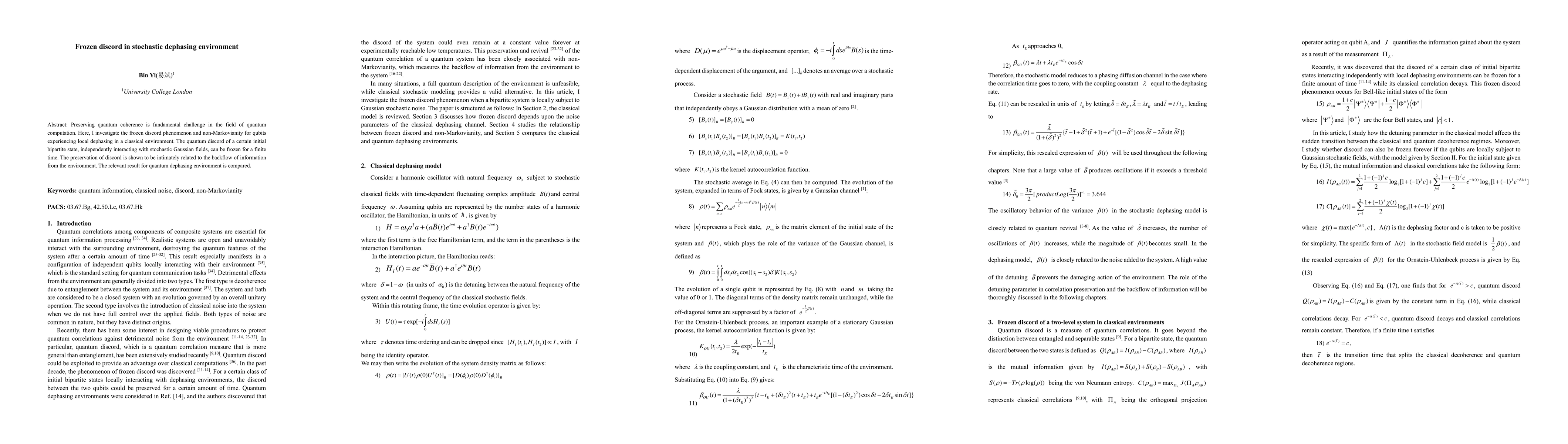 This paper explores the phenomenon of frozen discord in qubits undergoing local dephasing in a stochastic environment, demonstrating that quantum discord can remain constant for a finite duration. The study links this preservation to the backflow of information from the environment, contrasting it with results for quantum dephasing environments.