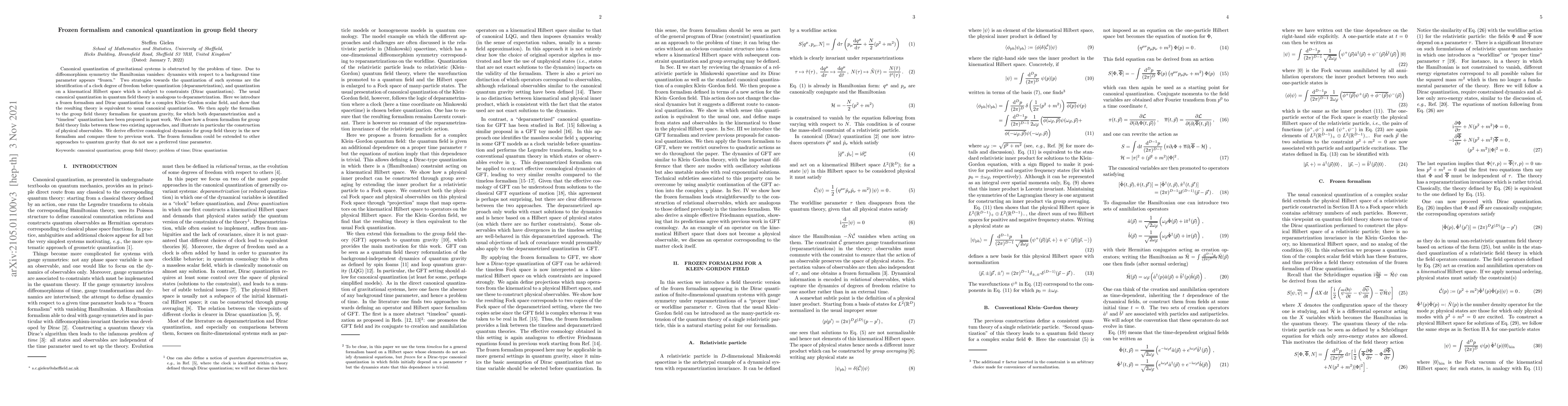 The paper presents a frozen formalism and its application to group field theory, demonstrating a method to construct a physical Hilbert space from a kinematical one, linking deparametrized and 'timeless' quantization approaches in quantum gravity.