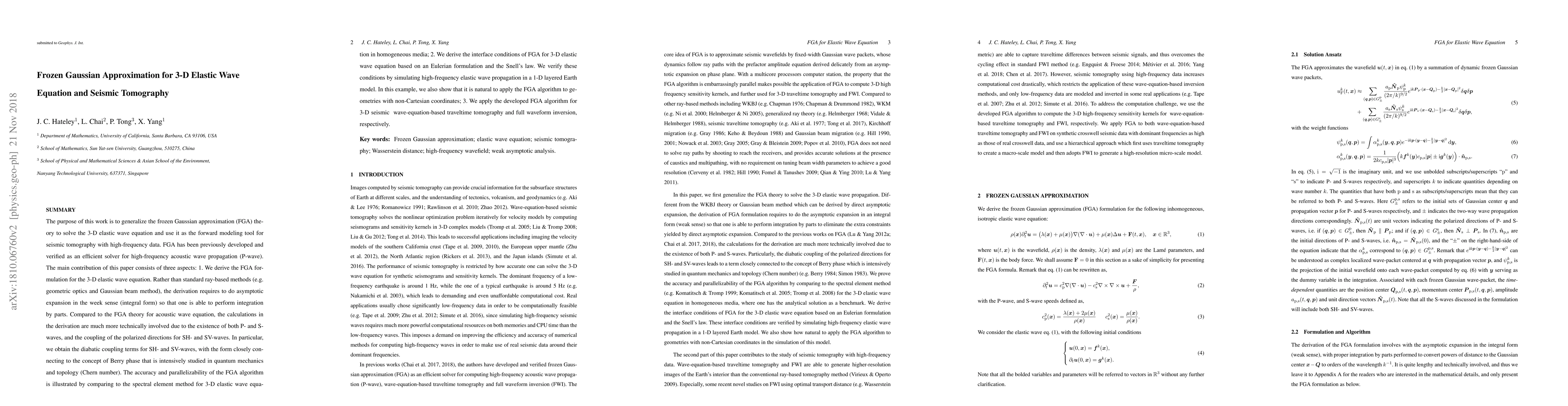This paper generalizes the frozen Gaussian approximation (FGA) theory to solve the 3-D elastic wave equation, introducing a more technically involved derivation that accounts for P-, S-, and diabatic coupling terms. The FGA algorithm is then applied to seismic tomography, demonstrating its accuracy and parallelizability through comparisons with the spectral element method.