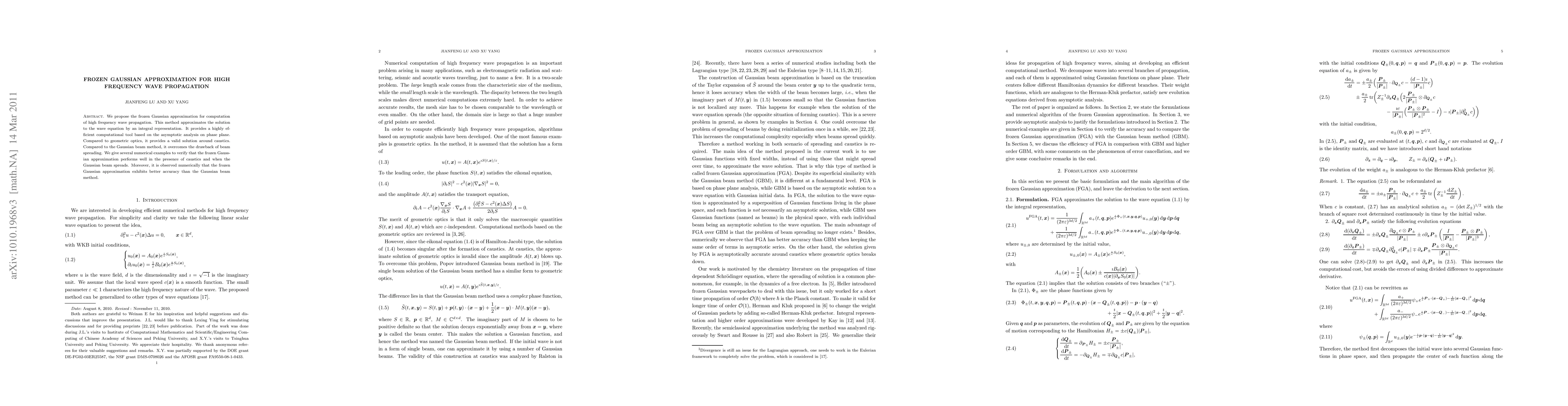 The frozen Gaussian approximation efficiently computes high-frequency wave propagation by using an integral representation, offering improved accuracy around caustics compared to geometric optics and overcoming beam spreading issues in the Gaussian beam method. Numerical examples demonstrate its effectiveness in challenging scenarios.