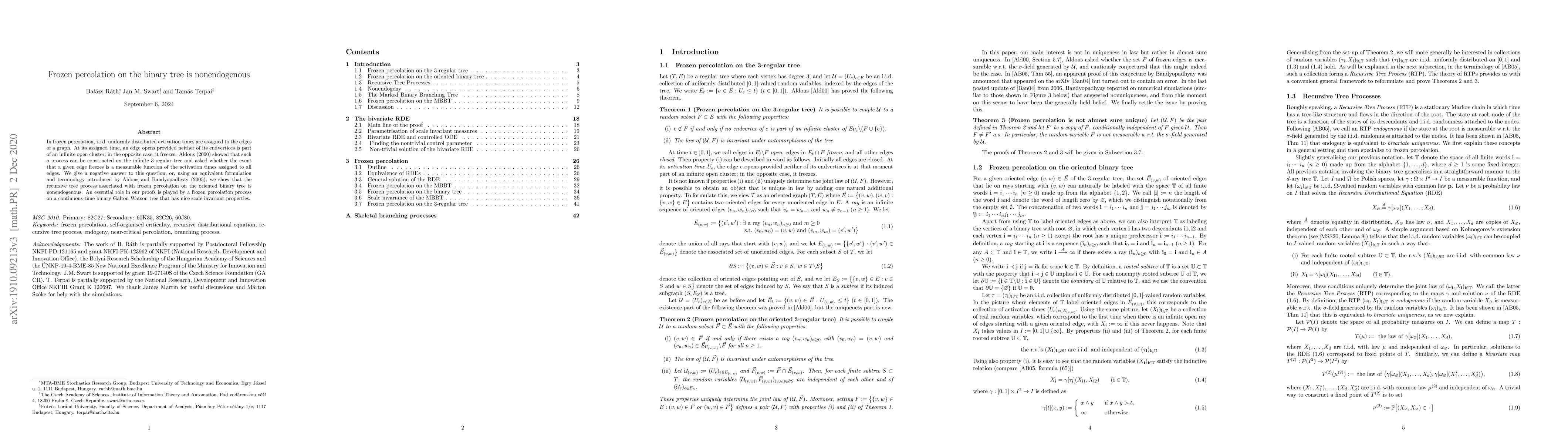 In frozen percolation, i.i.d. uniformly distributed activation times are assigned to the edges of a graph. At its assigned time, an edge opens provided neither of its endvertices is part of an infinite open cluster; in the opposite case, it freezes. Aldous (2000) showed that such a process can be constructed on the infinite 3-regular tree and asked whether the event that a given edge freezes is a measurable function of the activation times assigned to all edges. We give a negative answer to this question, or, using an equivalent formulation and terminology introduced by Aldous and Bandyopadhyay (2005), we show that the recursive tree process associated with frozen percolation on the oriented binary tree is nonendogenous. An essential role in our proofs is played by a frozen percolation process on a continuous-time binary Galton Watson tree that has nice scale invariant properties.
