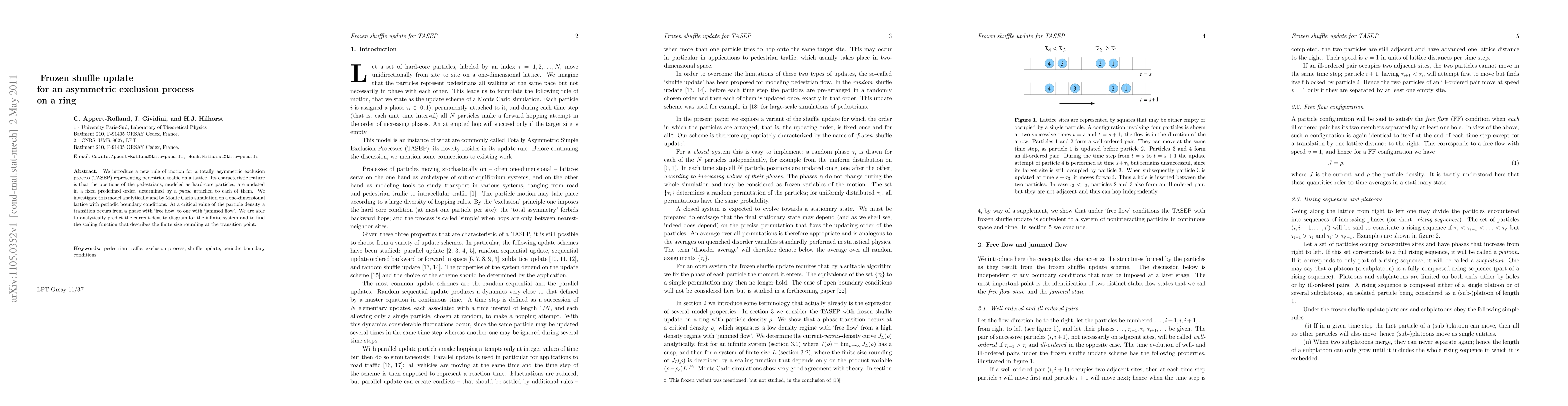 We introduce a new rule of motion for a totally asymmetric exclusion process (TASEP) representing pedestrian traffic on a lattice. Its characteristic feature is that the positions of the pedestrians, modeled as hard-core particles, are updated in a fixed predefined order, determined by a phase attached to each of them. We investigate this model analytically and by Monte Carlo simulation on a one-dimensional lattice with periodic boundary conditions. At a critical value of the particle density a transition occurs from a phase with `free flow' to one with `jammed flow'. We are able to analytically predict the current-density diagram for the infinite system and to find the scaling function that describes the finite size rounding at the transition point.
