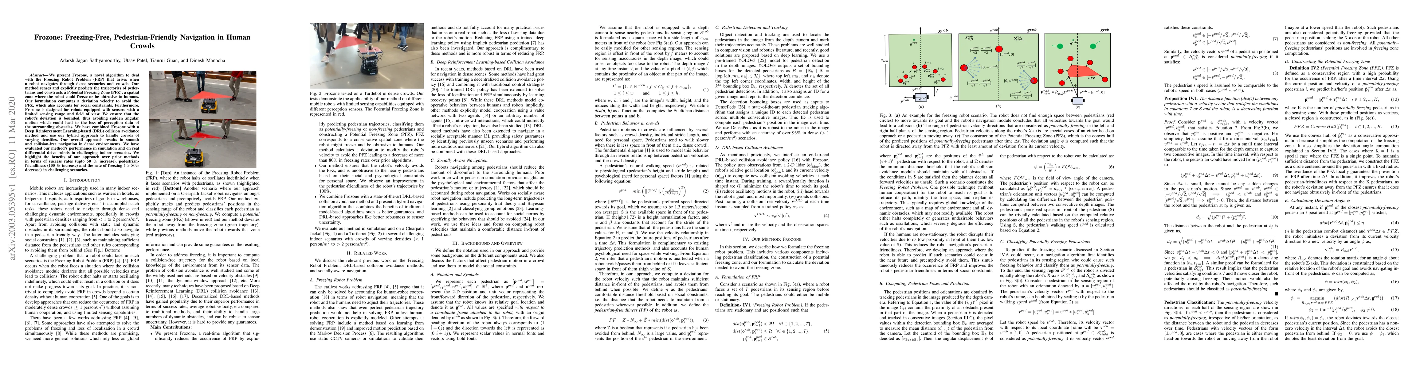 Frozone is a novel algorithm designed to address the Freezing Robot Problem in dense crowds by predicting pedestrian trajectories and constructing a Potential Freezing Zone. It combines a Deep Reinforcement Learning-based approach for smooth, collision-free navigation, showing significant improvements in success rates, pedestrian-friendliness, and freezing rates compared to prior methods.