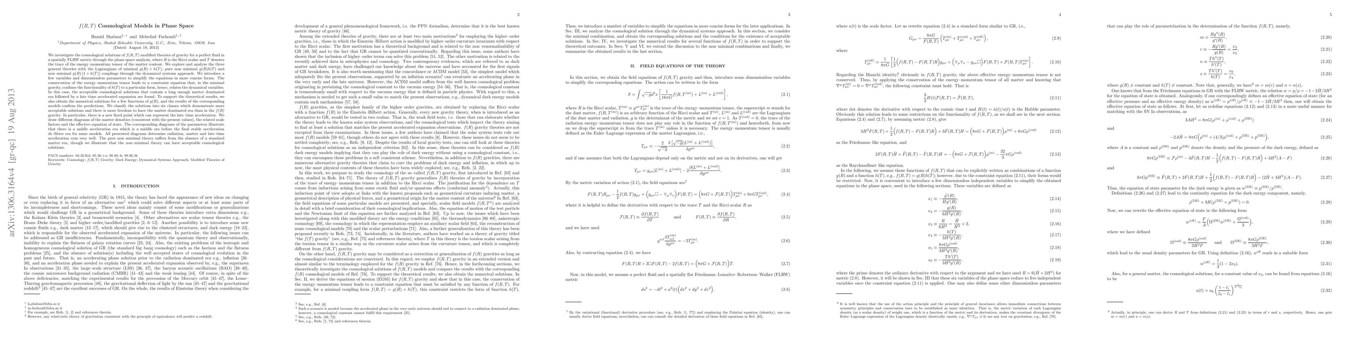 We investigate cosmological solutions of f(R,T) modified theories of gravity for perfect fluid in spatially FLRW metric through phase space analysis, where R is Ricci scalar and T denotes the trace of energy-momentum tensor of matter content. We explore and analyze three general theories with Lagrangians of minimal $g(R)+h(T)$, pure non--minimal g(R)h(T) and non-minimal $g(R)(1+h(T))$ couplings through dynamical systems approach. We introduce a few variables and dimensionless parameters to simplify the equations in more concise forms. The conservation of energy-momentum tensor leads to a constraint equation that, in the minimal gravity, confines functionality of h(T) to a particular form, hence, relates the dynamical variables. In this case, acceptable cosmological solutions that contain a long enough matter dominated era followed by a late-time accelerated expansion are found. To support theoretical results, we also obtain numerical solutions for a few functions of g(R), and results of the corresponding models confirm the predictions. We classify solutions into six classes which demonstrate more acceptable solutions and there is more freedom to have the matter dominated era than in the f(R) gravity. In particular, there is a new fixed point which can represent late-time acceleration. We draw different diagrams of the matter densities (consistent with the present values), the related scale factors and effective equation of state. The corresponding diagrams of parameters illustrate that there is a saddle acceleration era which is a middle era before final stable acceleration de Sitter era for some models. All presented diagrams determine radiation, matter and late-time acceleration eras very well.