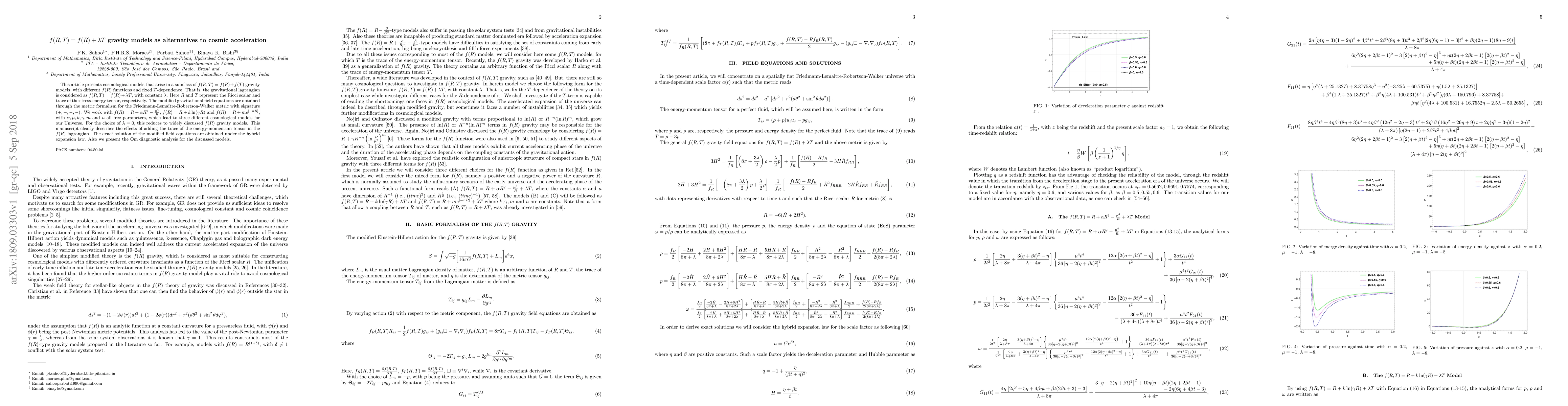 This article presents cosmological models that arise in a subclass of $f(R,T)=f(R)+f(T)$ gravity models, with different $f(R)$ functions and fixed $T$-dependence. That is, the gravitational lagrangian is considered as $f(R,T)=f(R)+\lambda T$, with constant $\lambda$. Here $R$ and $T$ represent the Ricci scalar and trace of the stress-energy tensor, respectively. The modified gravitational field equations are obtained through the metric formalism for the Friedmann-Lema\^itre-Robertson-Walker metric with signature $(+,-,-,-)$. We work with $f(R)=R+\alpha R^2-\frac{\mu^4}{R}$, $f(R)=R+k\ln(\gamma R)$ and $f(R)=R+me^{[-nR]}$, with $\alpha, \mu, k, \gamma, m$ and $n$ all free parameters, which lead to three different cosmological models for our Universe. For the choice of $\lambda=0$, this reduces to widely discussed $f(R)$ gravity models. This manuscript clearly describes the effects of adding the trace of the energy-momentum tensor in the $f(R)$ lagrangian. The exact solution of the modified field equations are obtained under the hybrid expansion law. Also we present the Om diagnostic analysis for the discussed models.