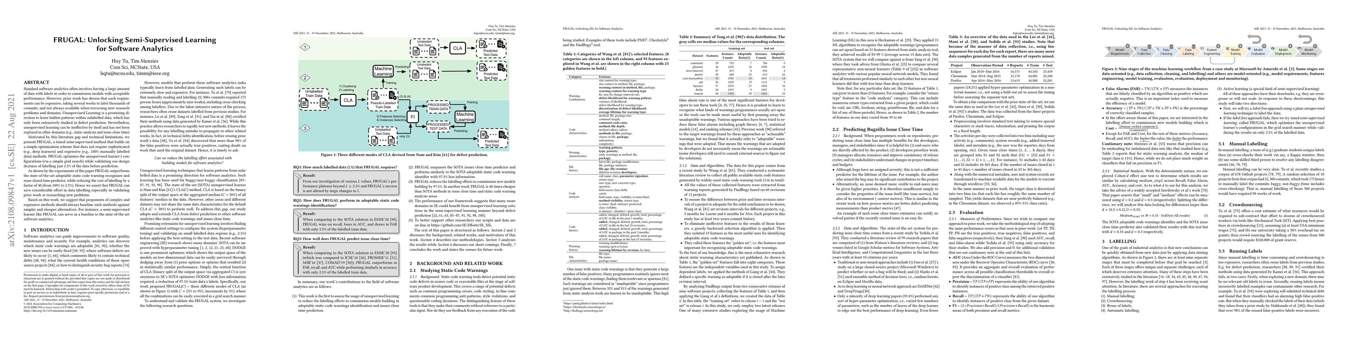 Standard software analytics often involves having a large amount of data with labels in order to commission models with acceptable performance. However, prior work has shown that such requirements can be expensive, taking several weeks to label thousands of commits, and not always available when traversing new research problems and domains. Unsupervised Learning is a promising direction to learn hidden patterns within unlabelled data, which has only been extensively studied in defect prediction. Nevertheless, unsupervised learning can be ineffective by itself and has not been explored in other domains (e.g., static analysis and issue close time). Motivated by this literature gap and technical limitations, we present FRUGAL, a tuned semi-supervised method that builds on a simple optimization scheme that does not require sophisticated (e.g., deep learners) and expensive (e.g., 100% manually labelled data) methods. FRUGAL optimizes the unsupervised learner's configurations (via a simple grid search) while validating our design decision of labelling just 2.5% of the data before prediction. As shown by the experiments of this paper FRUGAL outperforms the state-of-the-art adoptable static code warning recognizer and issue closed time predictor, while reducing the cost of labelling by a factor of 40 (from 100% to 2.5%). Hence we assert that FRUGAL can save considerable effort in data labelling especially in validating prior work or researching new problems. Based on this work, we suggest that proponents of complex and expensive methods should always baseline such methods against simpler and cheaper alternatives. For instance, a semi-supervised learner like FRUGAL can serve as a baseline to the state-of-the-art software analytics.