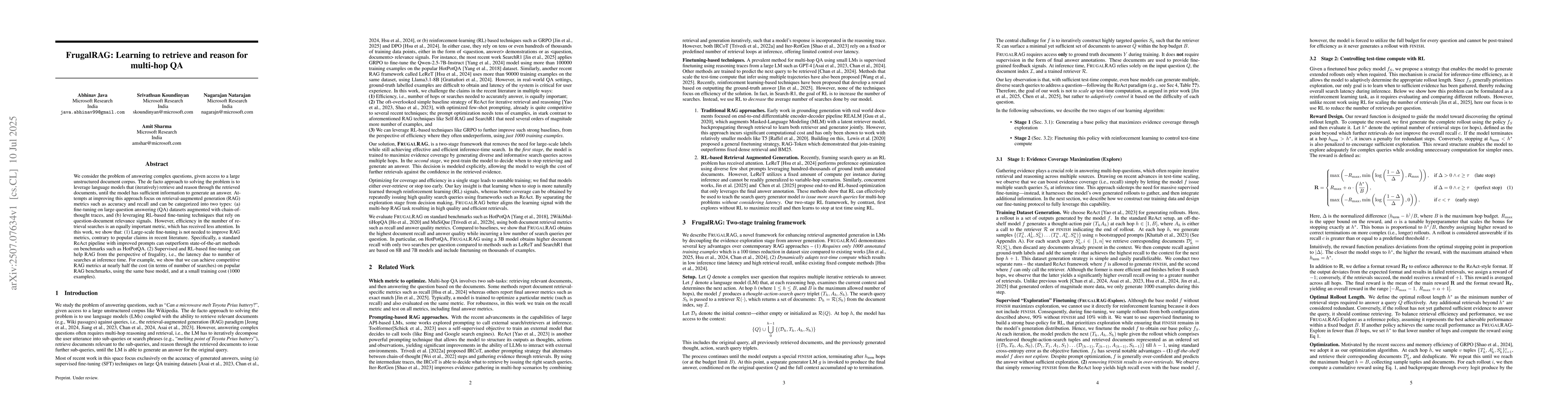 We consider the problem of answering complex questions, given access to a large unstructured document corpus. The de facto approach to solving the problem is to leverage language models that (iteratively) retrieve and reason through the retrieved documents, until the model has sufficient information to generate an answer. Attempts at improving this approach focus on retrieval-augmented generation (RAG) metrics such as accuracy and recall and can be categorized into two types: (a) fine-tuning on large question answering (QA) datasets augmented with chain-of-thought traces, and (b) leveraging RL-based fine-tuning techniques that rely on question-document relevance signals. However, efficiency in the number of retrieval searches is an equally important metric, which has received less attention. In this work, we show that: (1) Large-scale fine-tuning is not needed to improve RAG metrics, contrary to popular claims in recent literature. Specifically, a standard ReAct pipeline with improved prompts can outperform state-of-the-art methods on benchmarks such as HotPotQA. (2) Supervised and RL-based fine-tuning can help RAG from the perspective of frugality, i.e., the latency due to number of searches at inference time. For example, we show that we can achieve competitive RAG metrics at nearly half the cost (in terms of number of searches) on popular RAG benchmarks, using the same base model, and at a small training cost (1000 examples).