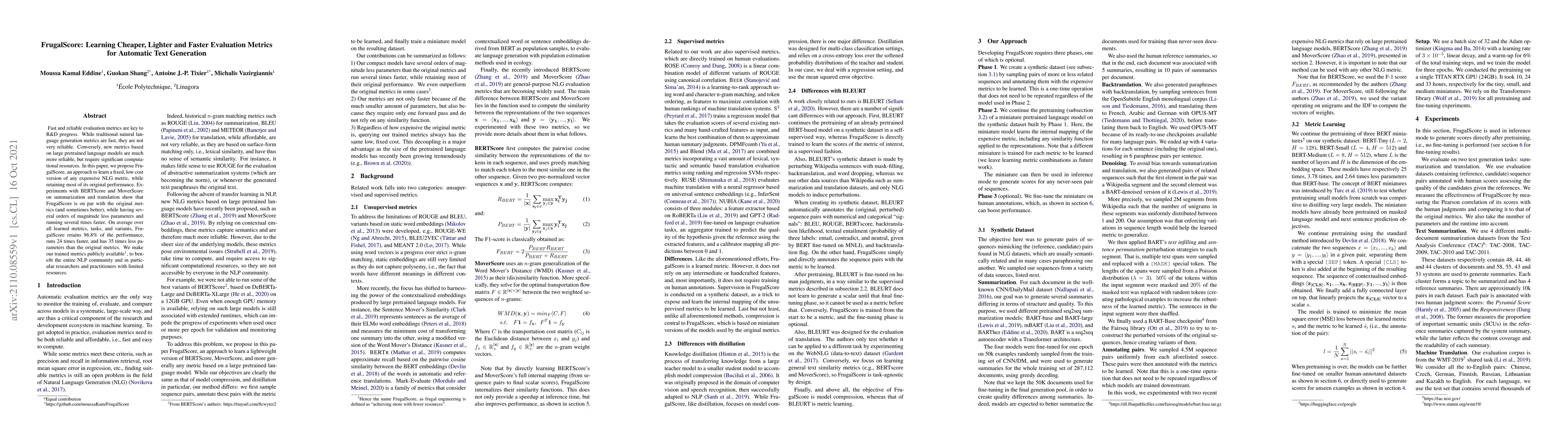 Fast and reliable evaluation metrics are key to R&D progress. While traditional natural language generation metrics are fast, they are not very reliable. Conversely, new metrics based on large pretrained language models are much more reliable, but require significant computational resources. In this paper, we propose FrugalScore, an approach to learn a fixed, low cost version of any expensive NLG metric, while retaining most of its original performance. Experiments with BERTScore and MoverScore on summarization and translation show that FrugalScore is on par with the original metrics (and sometimes better), while having several orders of magnitude less parameters and running several times faster. On average over all learned metrics, tasks, and variants, FrugalScore retains 96.8% of the performance, runs 24 times faster, and has 35 times less parameters than the original metrics. We make our trained metrics publicly available, to benefit the entire NLP community and in particular researchers and practitioners with limited resources.