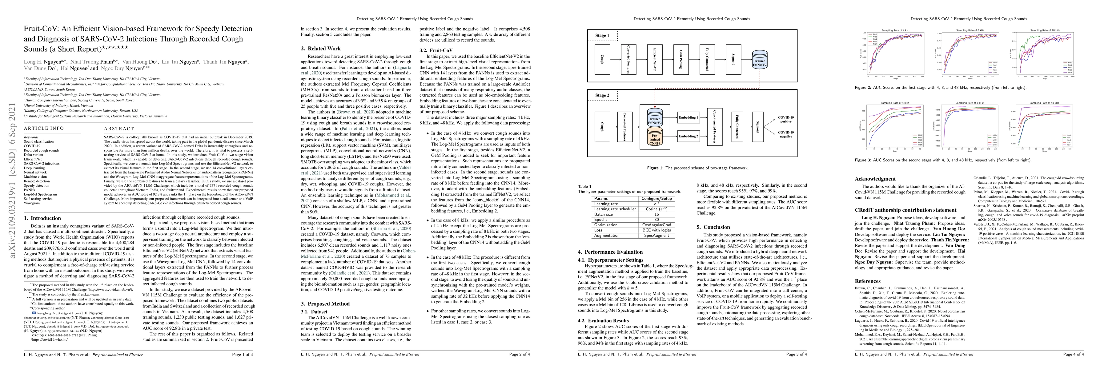 Fruit-CoV is a vision-based framework that uses recorded cough sounds to detect SARS-CoV-2 infections efficiently. It employs EfficientNet-V2 and convolutional layers from PANNs to analyze Log-Mel Spectrograms, achieving a 92.8% AUC score and first place in the AICovidVN Challenge.
