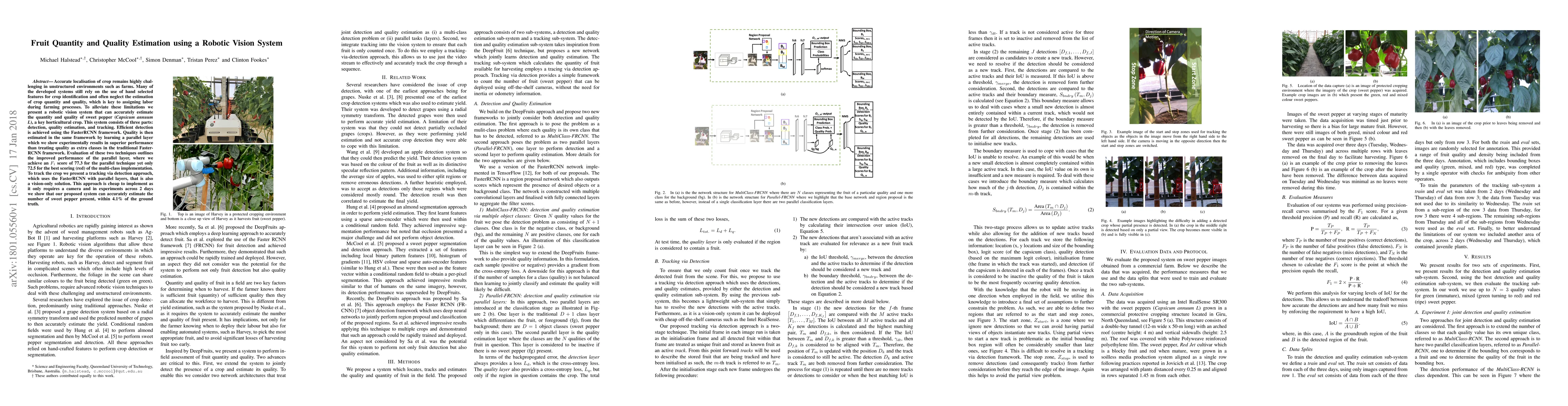Accurate localisation of crop remains highly challenging in unstructured environments such as farms. Many of the developed systems still rely on the use of hand selected features for crop identification and often neglect the estimation of crop quantity and quality, which is key to assigning labor during farming processes. To alleviate these limitations we present a robotic vision system that can accurately estimate the quantity and quality of sweet pepper (Capsicum annuum L), a key horticultural crop. This system consists of three parts: detection, quality estimation, and tracking. Efficient detection is achieved using the FasterRCNN framework. Quality is then estimated in the same framework by learning a parallel layer which we show experimentally results in superior performance than treating quality as extra classes in the traditional Faster-RCNN framework. Evaluation of these two techniques outlines the improved performance of the parallel layer, where we achieve an F1 score of 77.3 for the parallel technique yet only 72.5 for the best scoring (red) of the multi-class implementation. To track the crop we present a tracking via detection approach, which uses the FasterRCNN with parallel layers, that is also a vision-only solution. This approach is cheap to implement as it only requires a camera and in experiments across 2 days we show that our proposed system can accurately estimate the number of sweet pepper present, within 4.1% of the ground truth.