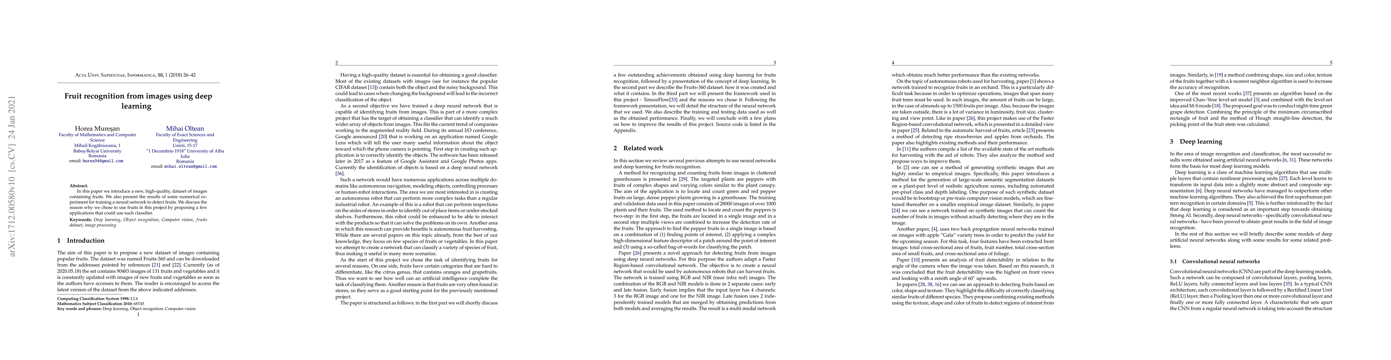 In this paper we introduce a new, high-quality, dataset of images containing fruits. We also present the results of some numerical experiment for training a neural network to detect fruits. We discuss the reason why we chose to use fruits in this project by proposing a few applications that could use this kind of neural network.