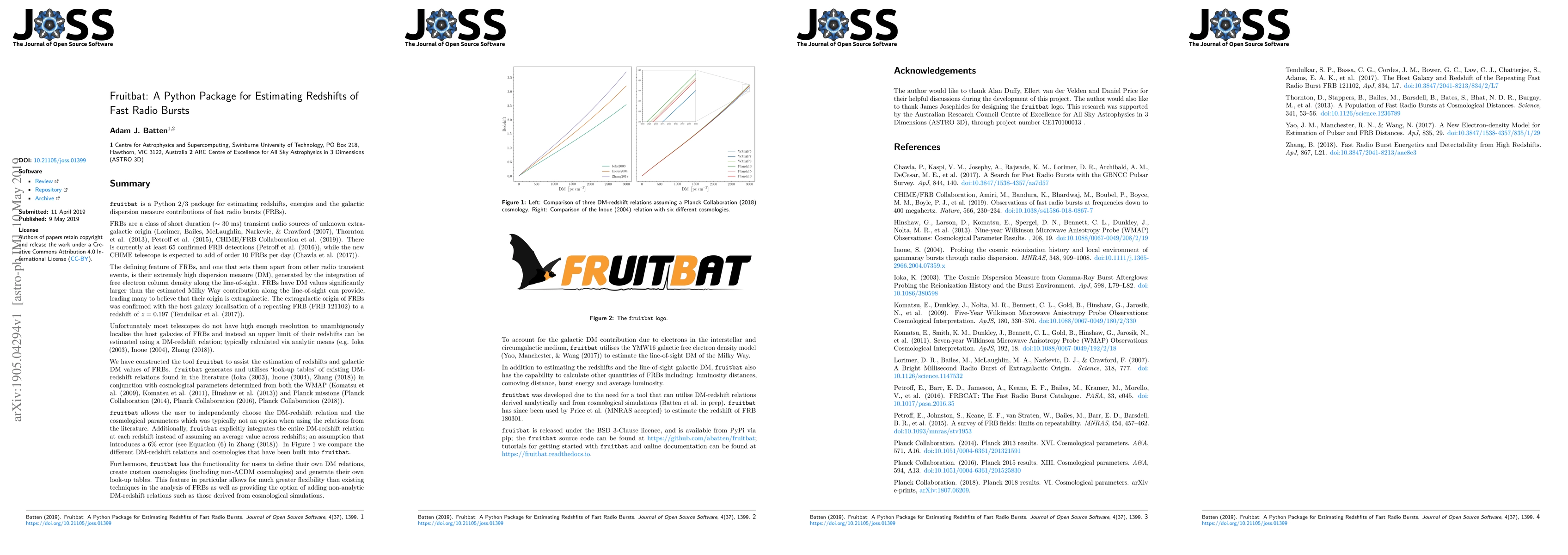 Fruitbat is an open source Python 2/3 package for estimating redshifts, energies and the galactic dispersion measure contributions of fast radio bursts (FRBs). Fruitbat combines various dispersion measure (DM) and redshift relations with the YMW16 galactic dispersion measure model into a single easy to use API.
