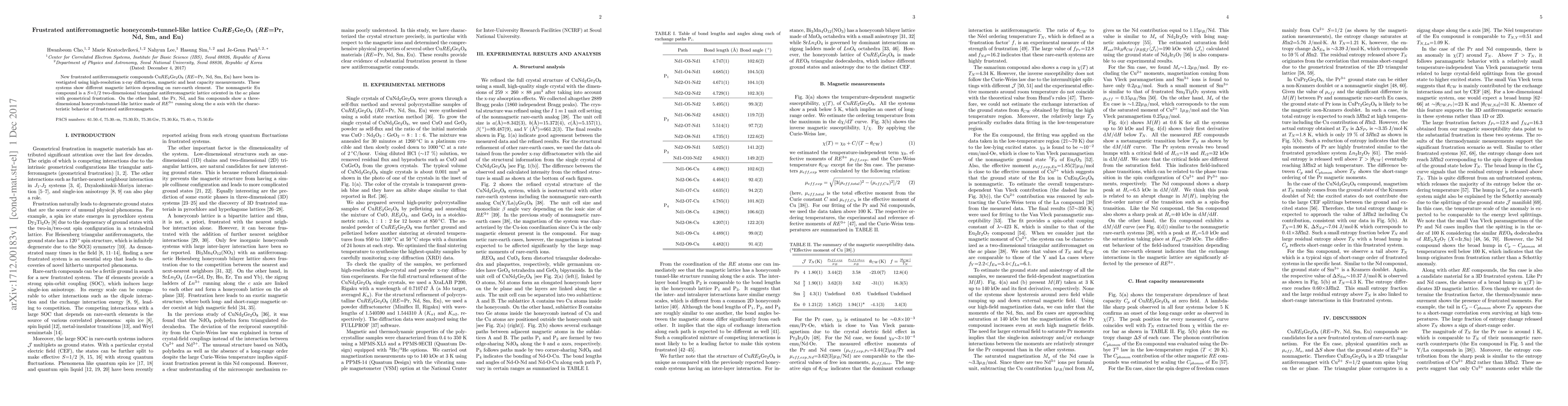 New frustrated antiferromagnetic compounds CuRE2Ge2O8 (RE=Pr, Nd, Sm, Eu) have been investigated using high-resolution x-ray diffraction, magnetic and heat capacity measurements. These systems show different magnetic lattices depending on rare-earth element. The nonmagnetic Eu compound is a S=1/2 two-dimensional triangular antiferromagnetic lattice oriented in the ac plane with geometrical frustration. On the other hand, the Pr, Nd, and Sm compounds show a three-dimensional honeycomb-tunnel-like lattice made of RE^3+ running along the a axis with the characteristic behavior of frustrated antiferromagnets.