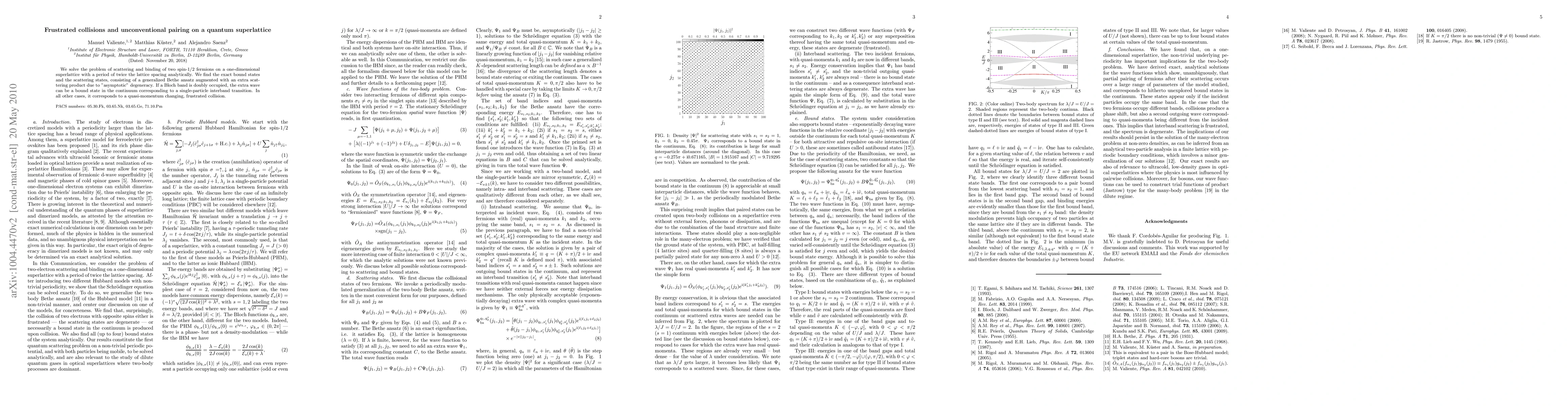 We solve the problem of scattering and binding of two spin-1/2 fermions on a one-dimensional superlattice with a period of twice the lattice spacing analytically. We find the exact bound states and the scattering states, consisting of a generalized Bethe ansatz augmented with an extra scattering product due to "asymptotic" degeneracy. If a Bloch band is doubly occupied, the extra wave can be a bound state in the continuum corresponding to a single-particle interband transition. In all other cases, it corresponds to a quasi-momentum changing, frustrated collision.
