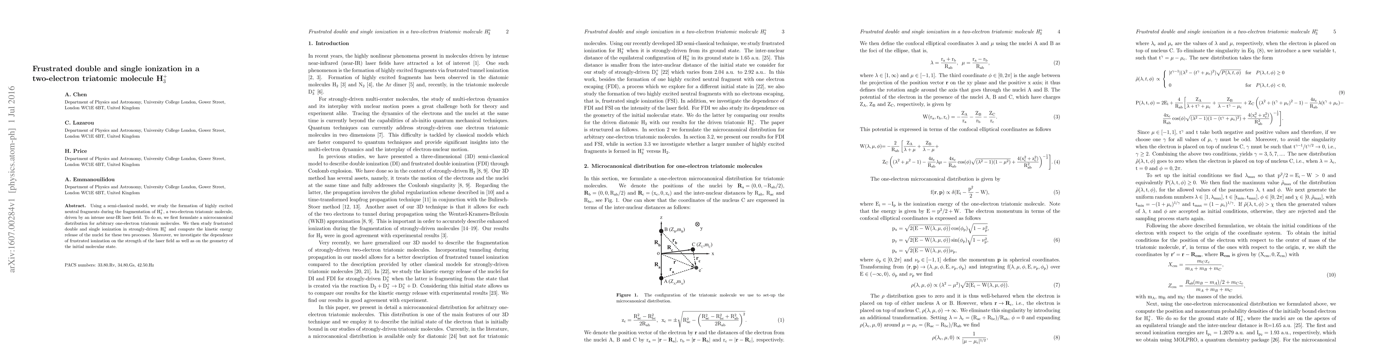 Using a semi-classical model, we study the formation of highly excited neutral fragments during the fragmentation of $\mathrm{H_3^+}$, a two-electron triatomic molecule, driven by an intense near-IR laser field. To do so, we first formulate a microcanonical distribution for arbitrary one-electron triatomic molecules. We then study frustrated double and single ionization in strongly-driven $\mathrm{H_3^+}$ and compute the kinetic energy release of the nuclei for these two processes. Moreover, we investigate the dependence of frustrated ionization on the strength of the laser field as well as on the geometry of the initial molecular state.