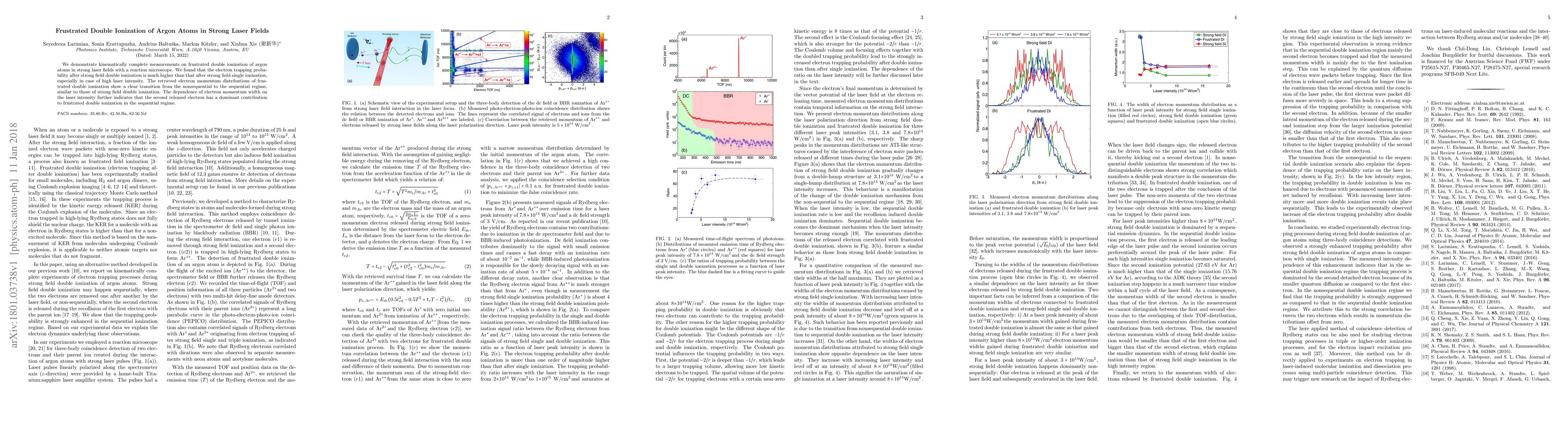 This study investigates frustrated double ionization of argon atoms using strong laser fields, revealing higher electron trapping after double ionization compared to single ionization, particularly at high laser intensities. The electron momentum distributions transition from nonsequential to sequential regimes, with the second electron playing a dominant role in the sequential regime.
