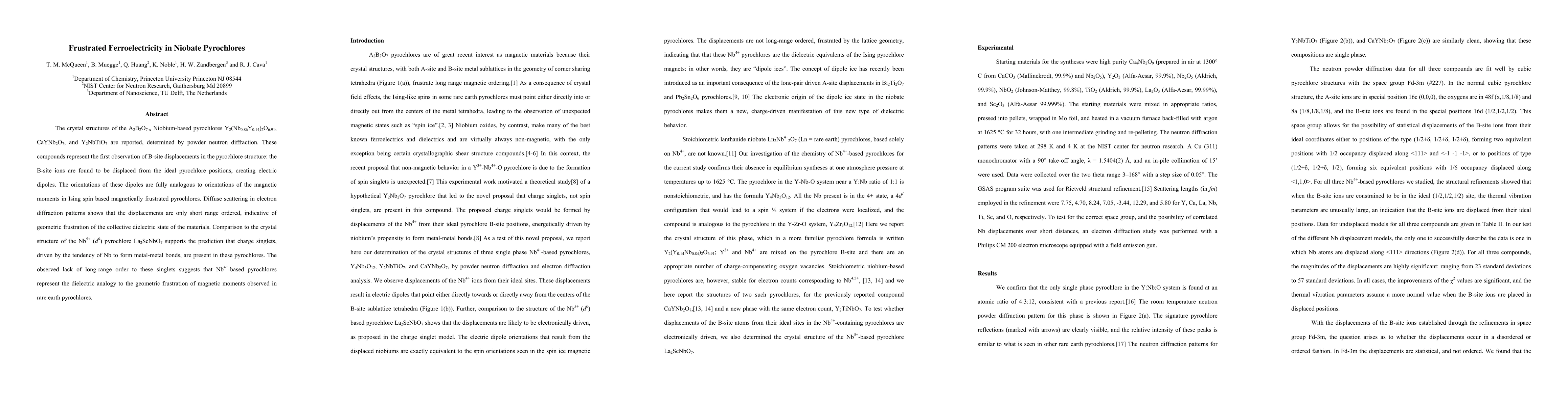This paper reports the first observation of B-site displacements in Niobate pyrochlores, leading to electric dipoles analogous to magnetic moments in frustrated magnetic pyrochlores. The short-range order of these displacements indicates geometric frustration in the dielectric state, suggesting Nb4+ pyrochlores as dielectric analogs to magnetically frustrated rare earth pyrochlores.