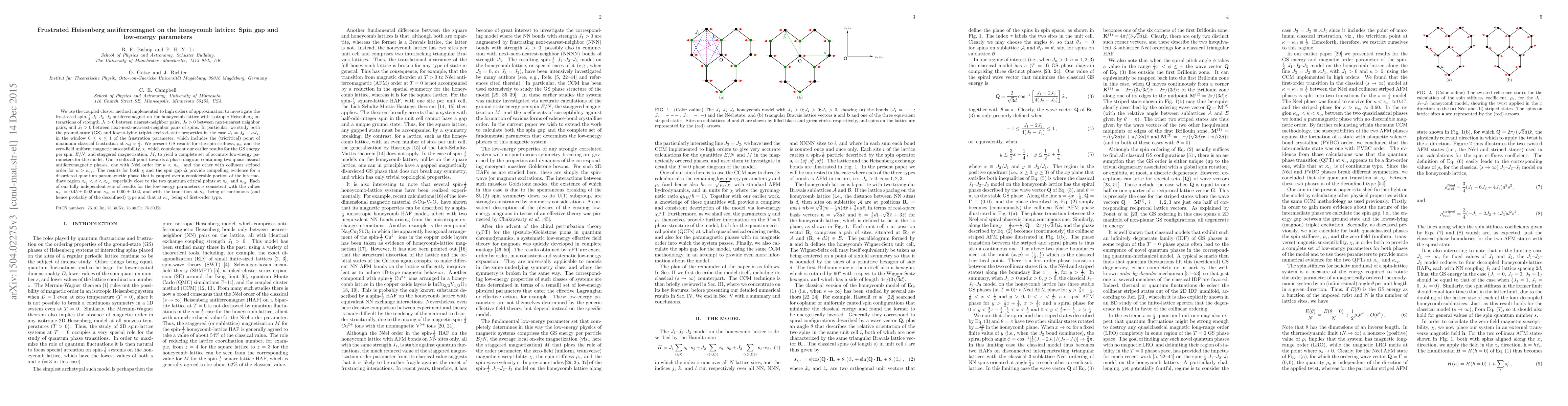 We use the coupled cluster method implemented to high orders of approximation to investigate the frustrated spin-$\frac{1}{2}$ $J_{1}$--$J_{2}$--$J_{3}$ antiferromagnet on the honeycomb lattice with isotropic Heisenberg interactions of strength $J_{1} > 0$ between nearest-neighbor pairs, $J_{2}>0$ between next-nearest-neighbor pairs, and $J_{3}>0$ between next-next-neareast-neighbor pairs of spins. In particular, we study both the ground-state (GS) and lowest-lying triplet excited-state properties in the case $J_{3}=J_{2} \equiv \kappa J_{1}$, in the window $0 \leq \kappa \leq 1$ of the frustration parameter, which includes the (tricritical) point of maximum classical frustration at $\kappa_{{\rm cl}} = \frac{1}{2}$. We present GS results for the spin stiffness, $\rho_{s}$, and the zero-field uniform magnetic susceptibility, $\chi$, which complement our earlier results for the GS energy per spin, $E/N$, and staggered magnetization, $M$, to yield a complete set of accurate low-energy parameters for the model. Our results all point towards a phase diagram containing two quasiclassical antiferromagnetic phases, one with N\'eel order for $\kappa < \kappa_{c_{1}}$, and the other with collinear striped order for $\kappa > \kappa_{c_{2}}$. The results for both $\chi$ and the spin gap $\Delta$ provide compelling evidence for a quantum paramagnetic phase that is gapped over a considerable portion of the intermediate region $\kappa_{c_{1}} < \kappa < \kappa_{c_{2}}$, especially close to the two quantum critical points at $\kappa_{c_{1}}$ and $\kappa_{c_{2}}$. Each of our fully independent sets of results for the low-energy parameters is consistent with the values $\kappa_{c_{1}} = 0.45 \pm 0.02$ and $\kappa_{c_{2}} = 0.60 \pm 0.02$, and with the transition at $\kappa_{c_{1}}$ being of continuous (and probably of the deconfined) type and that at $\kappa_{c_{2}}$ being of first-order type.