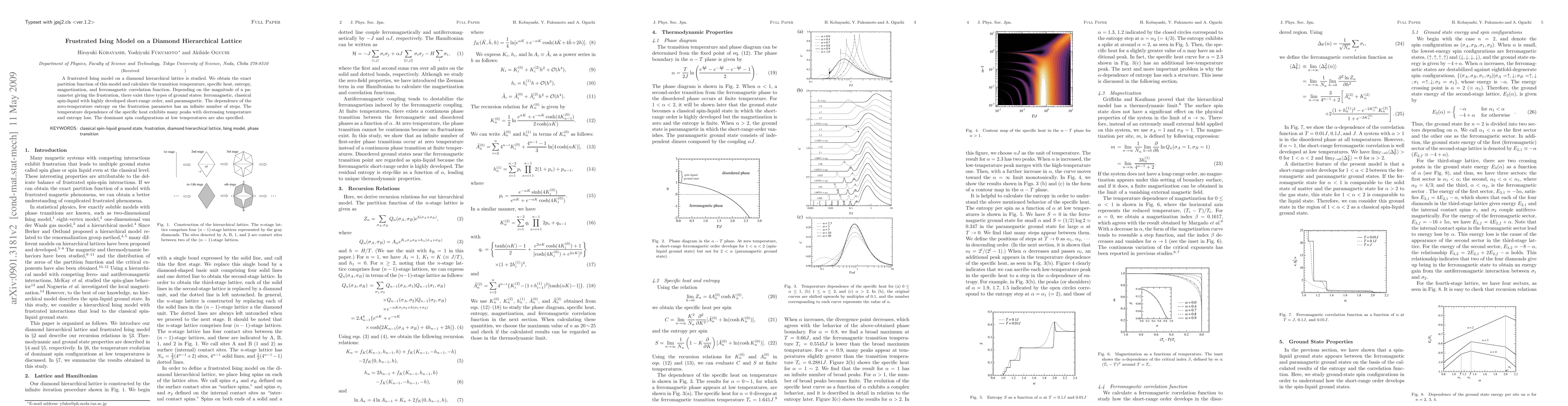 This paper studies a frustrated Ising model on a diamond hierarchical lattice, deriving the exact partition function and analyzing various thermodynamic properties. It identifies three distinct ground states and reveals a complex dependence of zero-temperature entropy on frustration, along with multiple peaks in the specific heat curve.