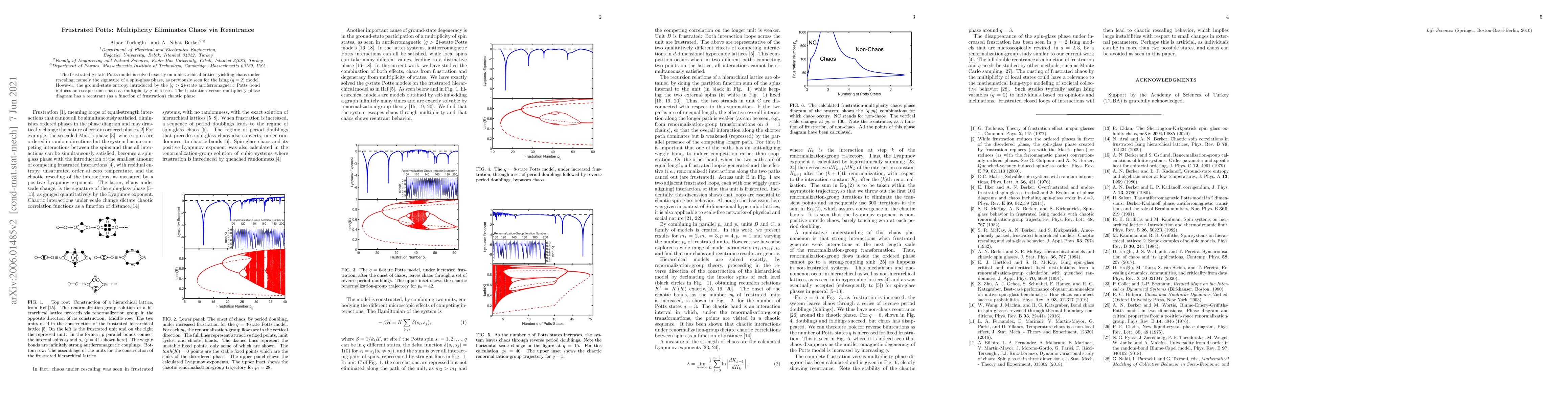 The frustrated q-state Potts model shows chaotic behavior in a spin-glass phase at low multiplicity levels (q<2), but escapes chaos as multiplicity increases, leading to a reentrant phase diagram with an increasing frustration versus multiplicity relation.