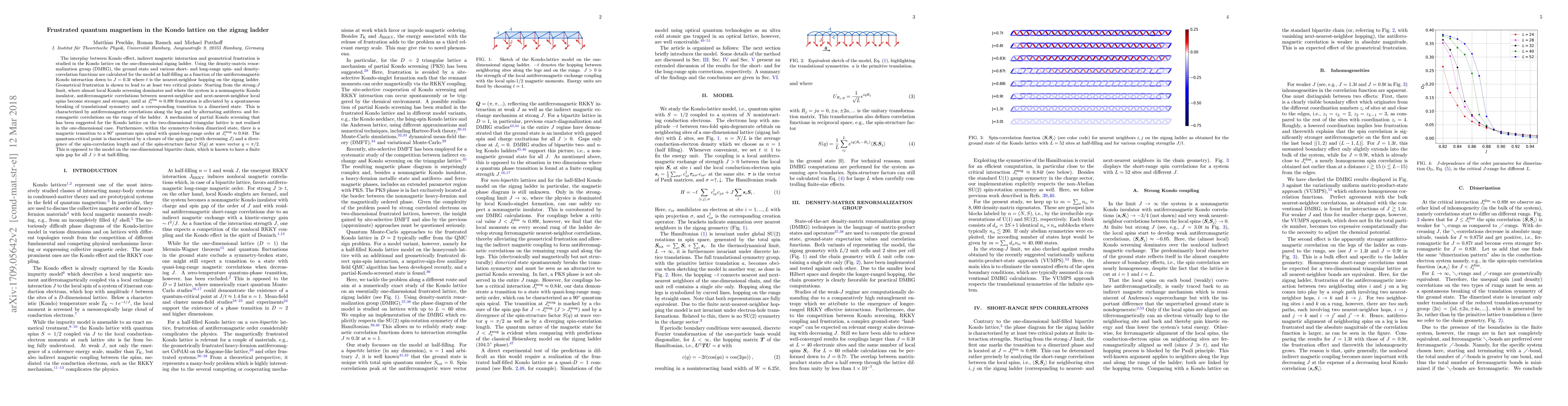 The research utilizes Density-Matrix Renormalization Group (DMRG) to investigate a Kondo lattice on a one-dimensional zigzag ladder, revealing two critical points due to geometrical frustration. At a stronger interaction ($J^{ m dim}_{ m c} approx 0.89t$), the system transitions to a dimerized state with alternating spin correlations. Further decreasing interaction leads to a $90^{circ}$ quantum spin spiral with quasi-long-range order at $J^{ m mag}_{ m c} approx 0.84t$, contrasting with the one-dimensional bipartite chain's finite spin gap for all $J > 0$.
