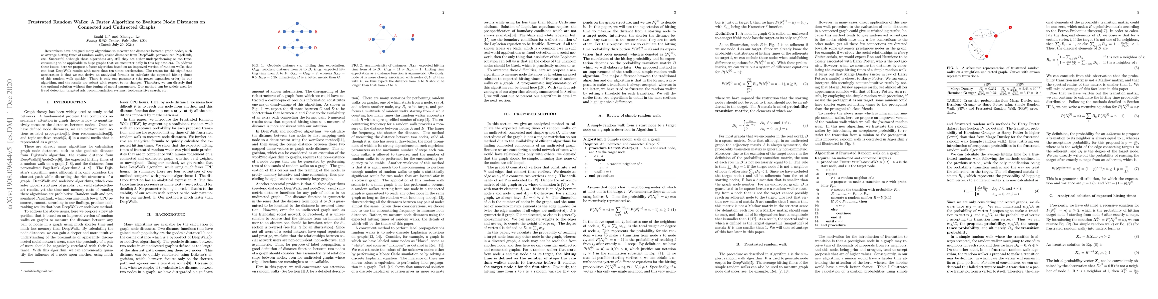 Researchers have designed many algorithms to measure the distances between graph nodes, such as average hitting times of random walks, cosine distances from DeepWalk, personalized PageRank, etc. Successful although these algorithms are, still they are either underperforming or too time-consuming to be applicable to huge graphs that we encounter daily in this big data era. To address these issues, here we propose a faster algorithm based on an improved version of random walks that can beat DeepWalk results with more than ten times acceleration. The reason for this significant acceleration is that we can derive an analytical formula to calculate the expected hitting times of this random walk quickly. There is only one parameter (the power expansion order) in our algorithm, and the results are robust with respect to its changes. Therefore, we can directly find the optimal solution without fine-tuning of model parameters. Our method can be widely used for fraud detection, targeted ads, recommendation systems, topic-sensitive search, etc.