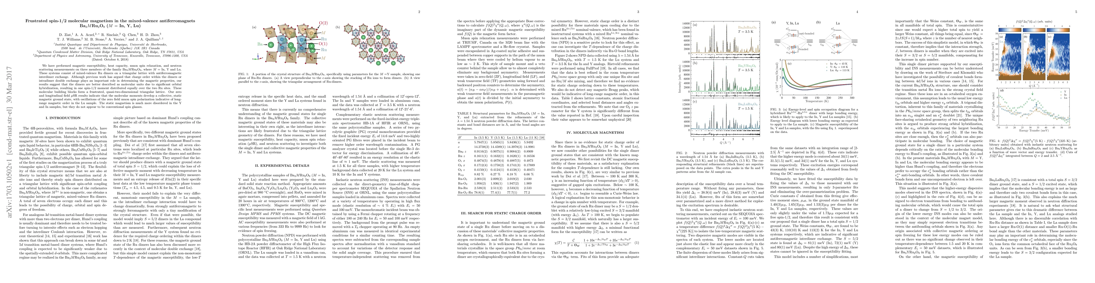 We have performed magnetic susceptibility, heat capacity, muon spin relaxation, and neutron scattering measurements on three members of the family Ba3MRu2O9, where M = In, Y and Lu. These systems consist of mixed-valence Ru dimers on a triangular lattice with antiferromagnetic interdimer exchange. Although previous work has argued that charge order within the dimers or intradimer double exchange plays an important role in determining the magnetic properties, our results suggest that the dimers are better described as molecular units due to significant orbital hybridization, resulting in one spin-1/2 moment distributed equally over the two Ru sites. These molecular building blocks form a frustrated, quasi-two-dimensional triangular lattice. Our zero and longitudinal field muSR results indicate that the molecular moments develop a collective, static magnetic ground state, with oscillations of the zero field muon spin polarization indicative of long-range magnetic order in the Lu sample. The static magnetism is much more disordered in the Y and In samples, but they do not appear to be conventional spin glasses.