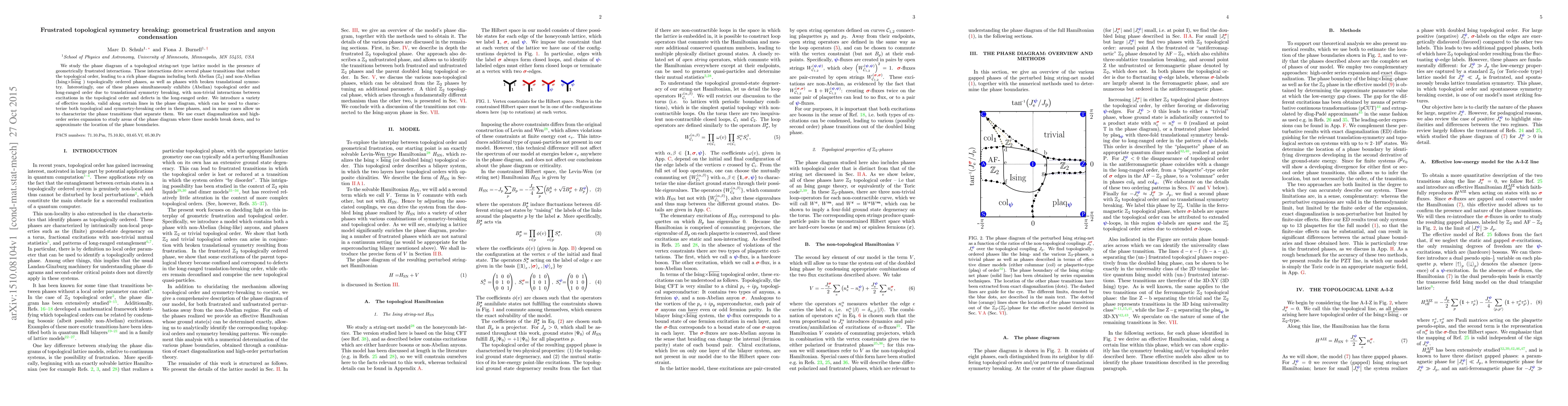 We study the phase diagram of a topological string-net type lattice model in the presence of geometrically frustrated interactions. These interactions drive several phase transitions that reduce the topological order, leading to a rich phase diagram including both Abelian ($\mathbb{Z}_2$) and non-Abelian ($\text{Ising}\times \overline{\text{Ising}}$) topologically ordered phases, as well as phases with broken translational symmetry. Interestingly, one of these phases simultaneously exhibits (Abelian) topological order and long-ranged order due to translational symmetry breaking, with non-trivial interactions between excitations in the topological order and defects in the long-ranged order. We introduce a variety of effective models, valid along certain lines in the phase diagram, which can be used to characterize both topological and symmetry-breaking order in these phases, and in many cases allow us to characterize the phase transitions that separate them. We use exact diagonalization and high-order series expansion to study areas of the phase diagram where these models break down, and to approximate the location of the phase boundaries.