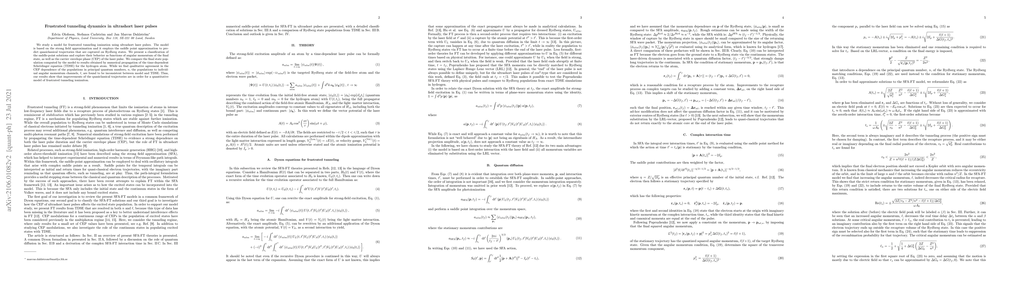 We study a model for frustrated tunneling ionization using ultrashort laser pulses. The model is based on the strong field approximation and it employs the saddle point approximation to predict quasiclassical trajectories that are captured on Rydberg states. We present a classification of the saddle-point solutions and explore their behavior as functions of angular momentum of the final state, as well as the carrier--envelope phase (CEP) of the laser pulse. We compare the final state population computed by the model to results obtained by numerical propagation of the time-dependent Schr\"odinger equation (TDSE) for the hydrogen atom. While we find qualitative agreement in the CEP dependence of the populations in principal quantum numbers, $n$, the populations to individual angular momentum channels, $\ell$, are found to be inconsistent between model and TDSE. Thus, our results show that improvements of the quasiclassical trajectories are in order for a quantitative model of frustrated tunneling ionizaiton.