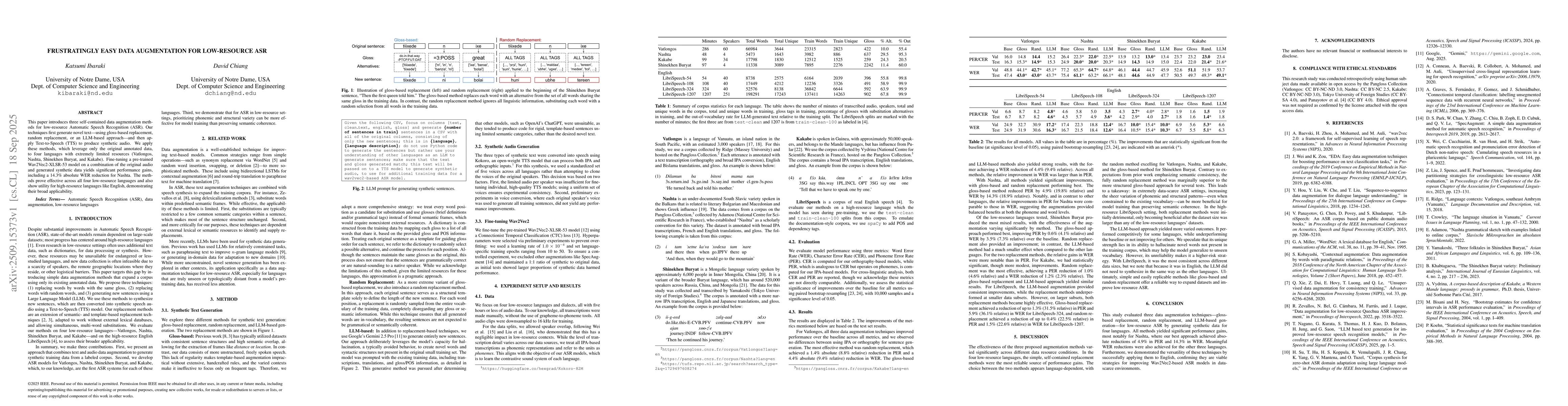 The paper introduces three self-contained data augmentation methods for low-resource ASR: gloss-based replacement, random replacement, and LLM-based generation. These methods generate synthetic text using the original annotated data and convert it to speech via TTS to create synthetic audio. The methods are applied to four low-resource languages, and a pre-trained Wav2Vec2-XLSR-53 model is fine-tuned on the combined original and synthetic data.