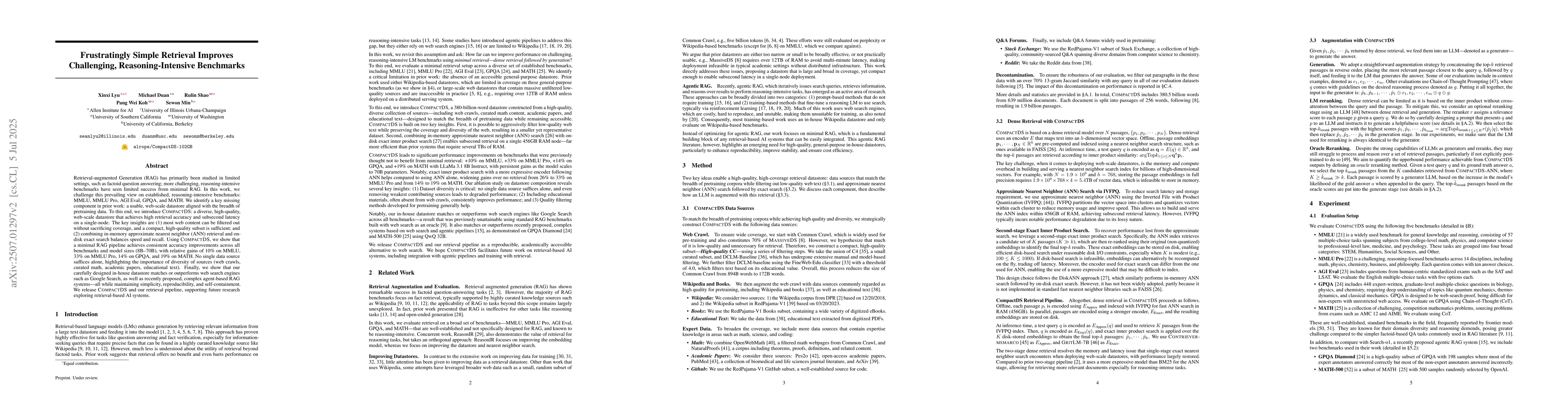 Retrieval-augmented Generation (RAG) has primarily been studied in limited settings, such as factoid question answering; more challenging, reasoning-intensive benchmarks have seen limited success from minimal RAG. In this work, we challenge this prevailing view on established, reasoning-intensive benchmarks: MMLU, MMLU Pro, AGI Eval, GPQA, and MATH. We identify a key missing component in prior work: a usable, web-scale datastore aligned with the breadth of pretraining data. To this end, we introduce CompactDS: a diverse, high-quality, web-scale datastore that achieves high retrieval accuracy and subsecond latency on a single-node. The key insights are (1) most web content can be filtered out without sacrificing coverage, and a compact, high-quality subset is sufficient; and (2) combining in-memory approximate nearest neighbor (ANN) retrieval and on-disk exact search balances speed and recall. Using CompactDS, we show that a minimal RAG pipeline achieves consistent accuracy improvements across all benchmarks and model sizes (8B--70B), with relative gains of 10% on MMLU, 33% on MMLU Pro, 14% on GPQA, and 19% on MATH. No single data source suffices alone, highlighting the importance of diversity of sources (web crawls, curated math, academic papers, textbooks). Finally, we show that our carefully designed in-house datastore matches or outperforms web search engines such as Google Search, as well as recently proposed, complex agent-based RAG systems--all while maintaining simplicity, reproducibility, and self-containment. We release CompactDS and our retrieval pipeline, supporting future research exploring retrieval-based AI systems.