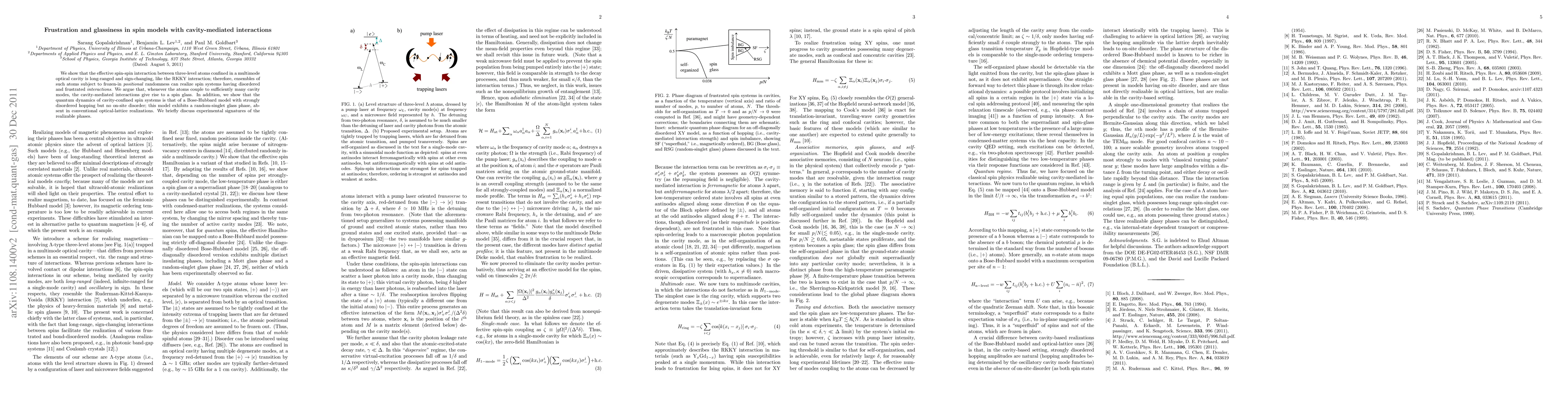 We show that the effective spin-spin interaction between three-level atoms confined in a multimode optical cavity is long-ranged and sign-changing, like the RKKY interaction; therefore, ensembles of such atoms subject to frozen-in positional randomness can realize spin systems having disordered and frustrated interactions. We argue that, whenever the atoms couple to sufficiently many cavity modes, the cavity-mediated interactions give rise to a spin glass. In addition, we show that the quantum dynamics of cavity-confined spin systems is that of a Bose-Hubbard model with strongly disordered hopping but no on-site disorder; this model exhibits a random-singlet glass phase, absent in conventional optical-lattice realizations. We briefly discuss experimental signatures of the realizable phases.