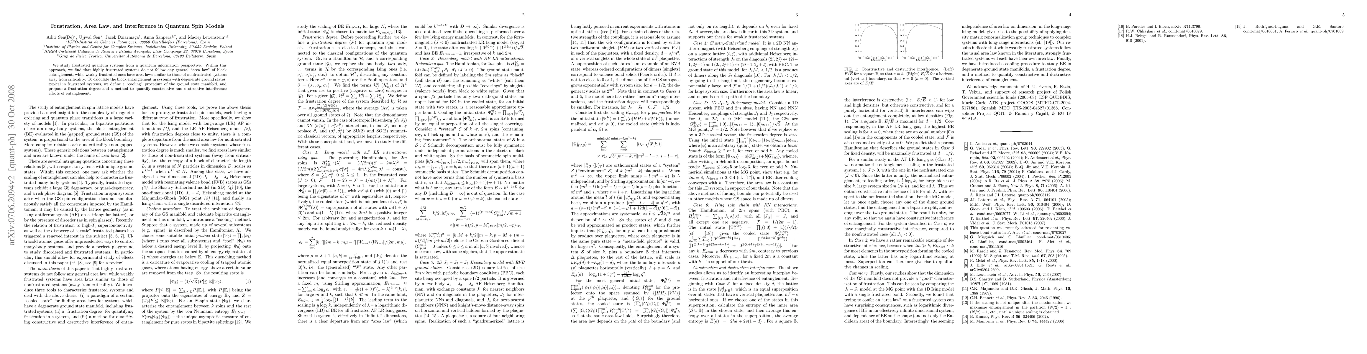 This paper investigates the entanglement properties of frustrated quantum spin models, revealing that highly frustrated systems deviate from the "area law" of block entanglement, unlike weakly frustrated systems. The authors propose a "cooling" procedure to quantify entanglement in degenerate ground states and introduce a method to measure interference effects.